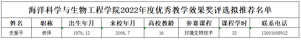 经个人申报,公司审核,学术委员会投票表决,现将海洋科学与2022年度优秀教学效果奖评选拟推荐名单公示如下,公示期为三天,时间2022.5.13--2022.5.16。如有异议,请在公示期内与公司教学办联系,联系电话0532--84022929。