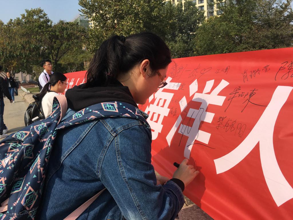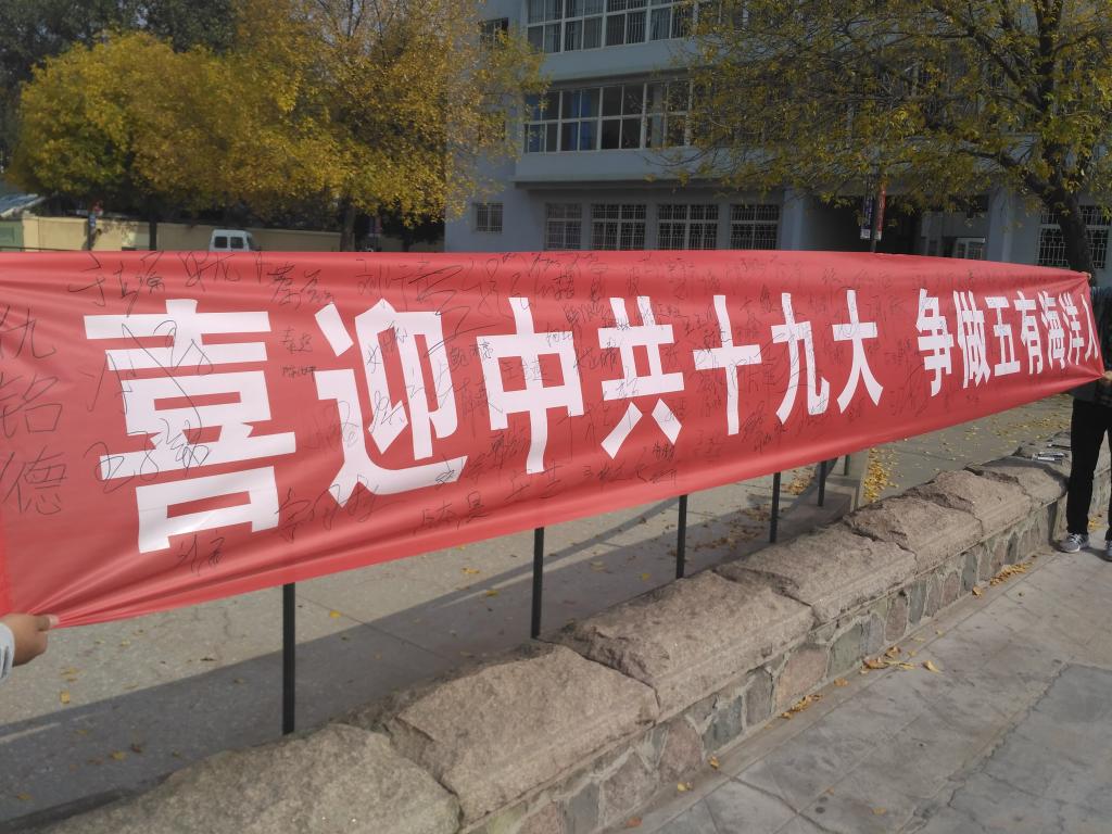 10月21日,海洋公司员工会在小五四北举办横幅签字活动,旨在通过签字活动加强员工争做最美海洋人思想意识。活动伊始,同学们纷纷在“喜迎中共十九大,争做五有海洋人“的横幅前驻足、关注并签下自己的名字。签名活动仅持续了一个小时,但横幅上已经签满了同学们的名字,大家用实际行动响应号召,以实际行动表明认真学习党的十九大精神。