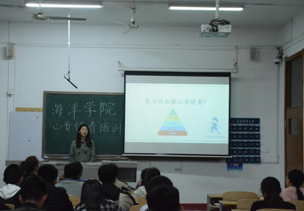 10月20日晚6:00,海洋公司于四方校区二教104室开展了“心音使者”培训讲座,旨在让公司“心音使者”了解心理健康的基本知识以及他们能够辅助辅导员做的心理健康方面的工作。本次讲座由公司2019级辅导员刘璐担任主讲人,全体新生舍长参与了本次培训。