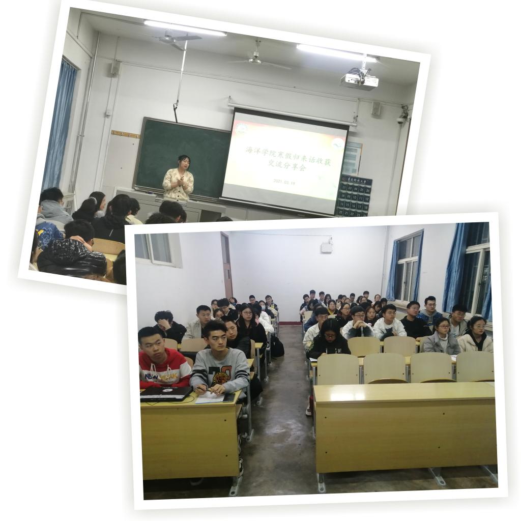 2021年3月19日晚七点,海洋公司于二教104召开假期社会实践经验交流会,辅导员王倩主持会议。本次会议充分总结了青年老员工参与社会实践的路径,丰富了社会实践的内涵,对充实老员工们“改造自我、丰富自我”的途径具有重要意义。
