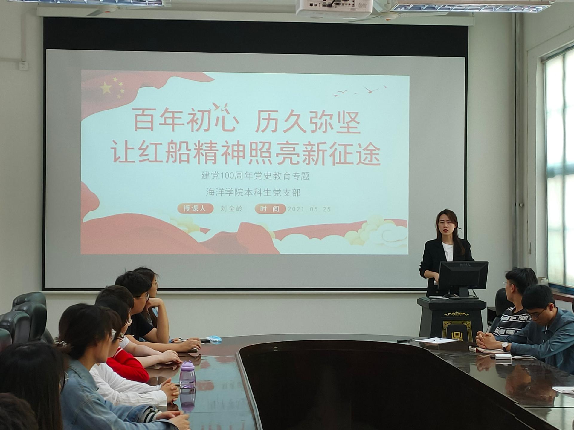 铭记百年党史,砥砺奋进前行。值此建党100周年之际,为更好地开展党史学习教育,5月25日,海洋公司本科生党支部书记刘金岭在一政第二会议室以“百年初心历久弥坚让红船精神照亮新征途”为题为本支部全体党员讲专题党课。