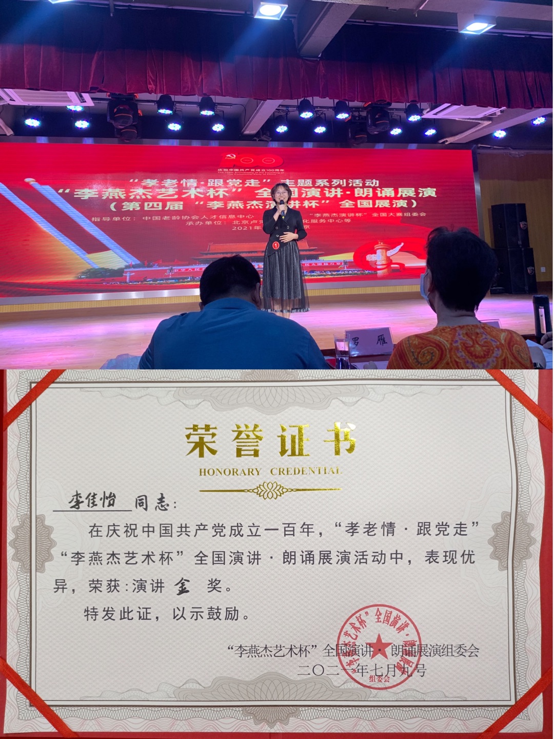 近日,由中国老龄协会老年人才信息中心指导,李燕杰艺术杯全国组委会主办的“孝老情·跟党走·李燕杰艺术杯”全国演讲·朗诵艺术展演在京圆满举行,海洋公司海洋202班李佳怡荣获金奖。