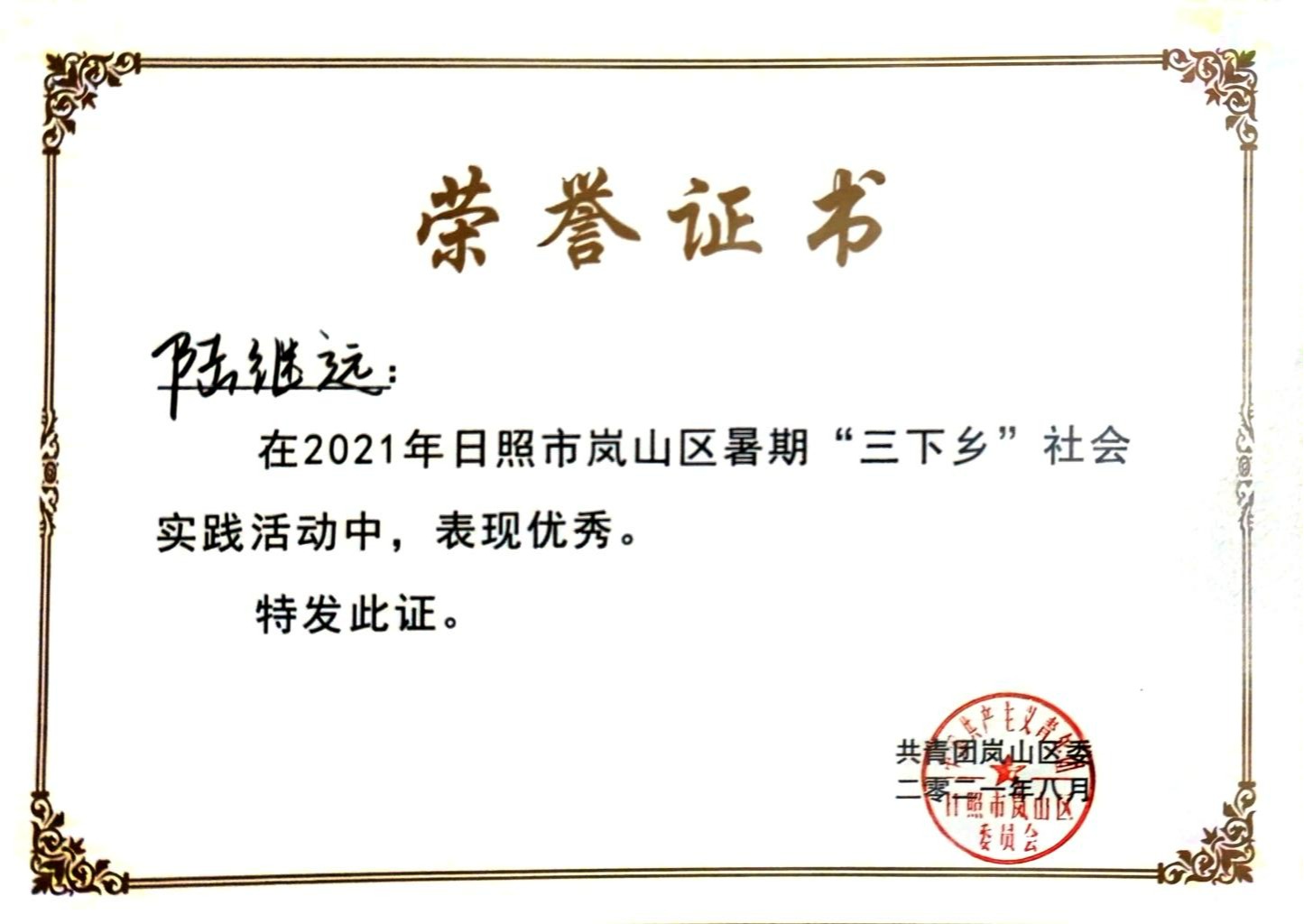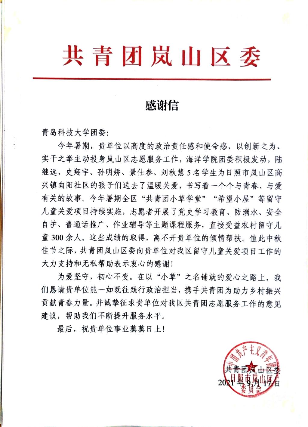 近日,日照岚山区团委向海洋公司团委发来感谢信,表达了对本次公司派出的暑期社会实践团队的感谢之情,对由陆继远、孙明娇、史翔宇、景仕参、刘秋慧5位同学组成的“心互联·新能源”志愿服务队在高兴镇向阳社区开展的“共青团小草学堂”“希望小屋”等工作表达肯定,赞扬了青科学子乐于奉献的优秀品德,感谢公司对志愿服务工作一直以来的鼓励与支持。