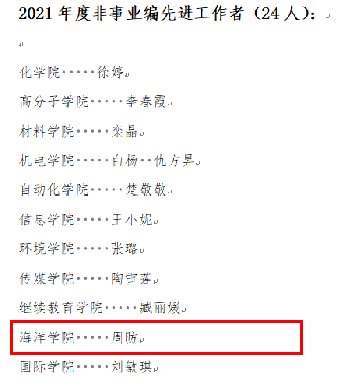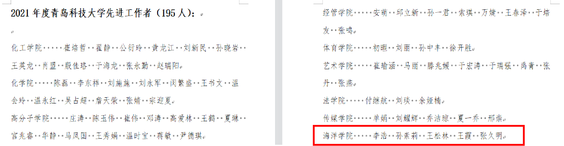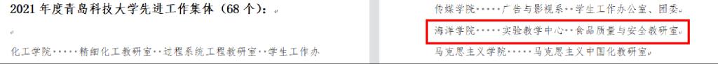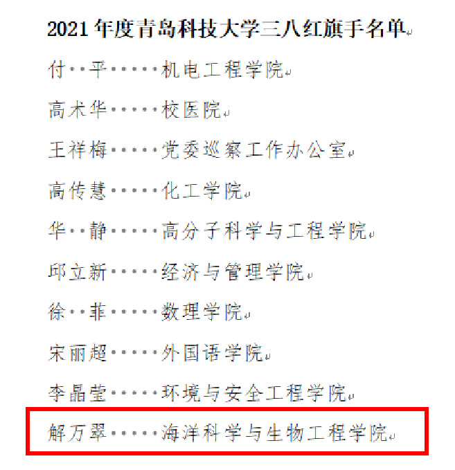 海洋公司解万翠教授荣获“三八红旗手”,实验中心荣获“教育先锋号”;实验中心、食品质量与安全教研室荣获“先进集体”,王松林、王霞、张久明、孙素莉、李浩、周昉荣获“先进工作者”;李昉荣获“先进女职工”,张慧、王秀丹、杨芳、李红芳荣获“工会先进工作者”。