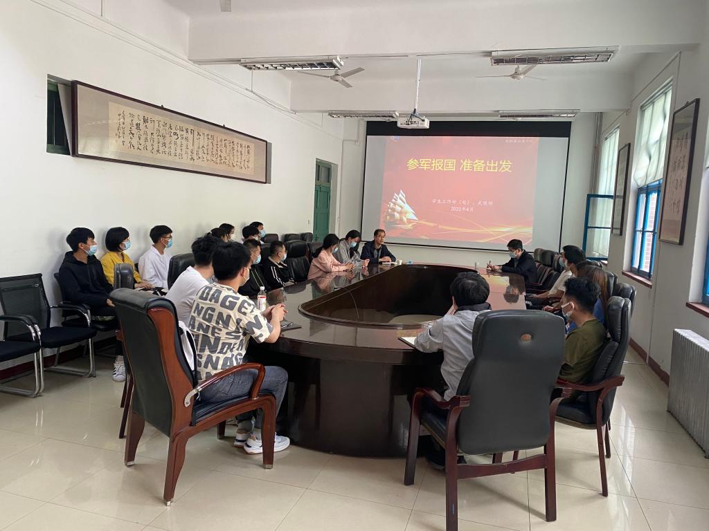 为进一步提高员工参军入伍积极性,宣传最新征兵政策,动员更多科大学子参军入伍,4月22日下午,党委员工工作部(处)、武装部副部长曹永俊在四方校区第二会议室为海洋公司、环境公司意向入伍员工进行宣讲,海洋公司党总支副书记兼副经理臧传永及两公司辅导员参加。