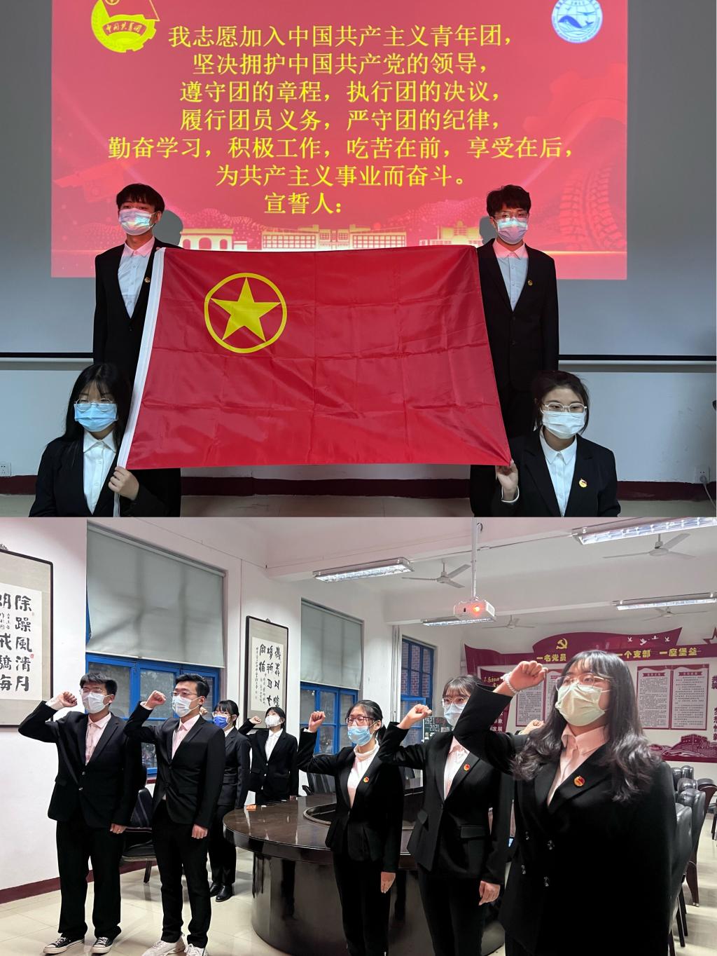 “我志愿加入中国共产主义青年团,坚决拥护中国共产党的领导......”在优秀团员代表于晓蕾的带领下,新团员们面向团旗,举起右拳,用青春激昂的声音庄严宣誓。随后,优秀团员代表莫少涵宣读《中国共产主义青年团章程》中有关团员义务和权利的条款。