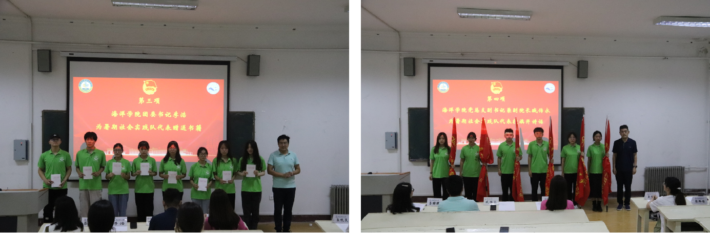 仪式上,李浩为社会实践重点队伍代表赠送《在庆祝中国共产主义青年团成立100周年大会上的讲话》(单行本)。2021级辅导员吕珊珊宣读了《2022年老员工志愿者暑期文化科技卫生“三下乡”社会实践活动的通知》,2020级辅导员刘金岭宣读《海洋公司校级重点团队名单》。