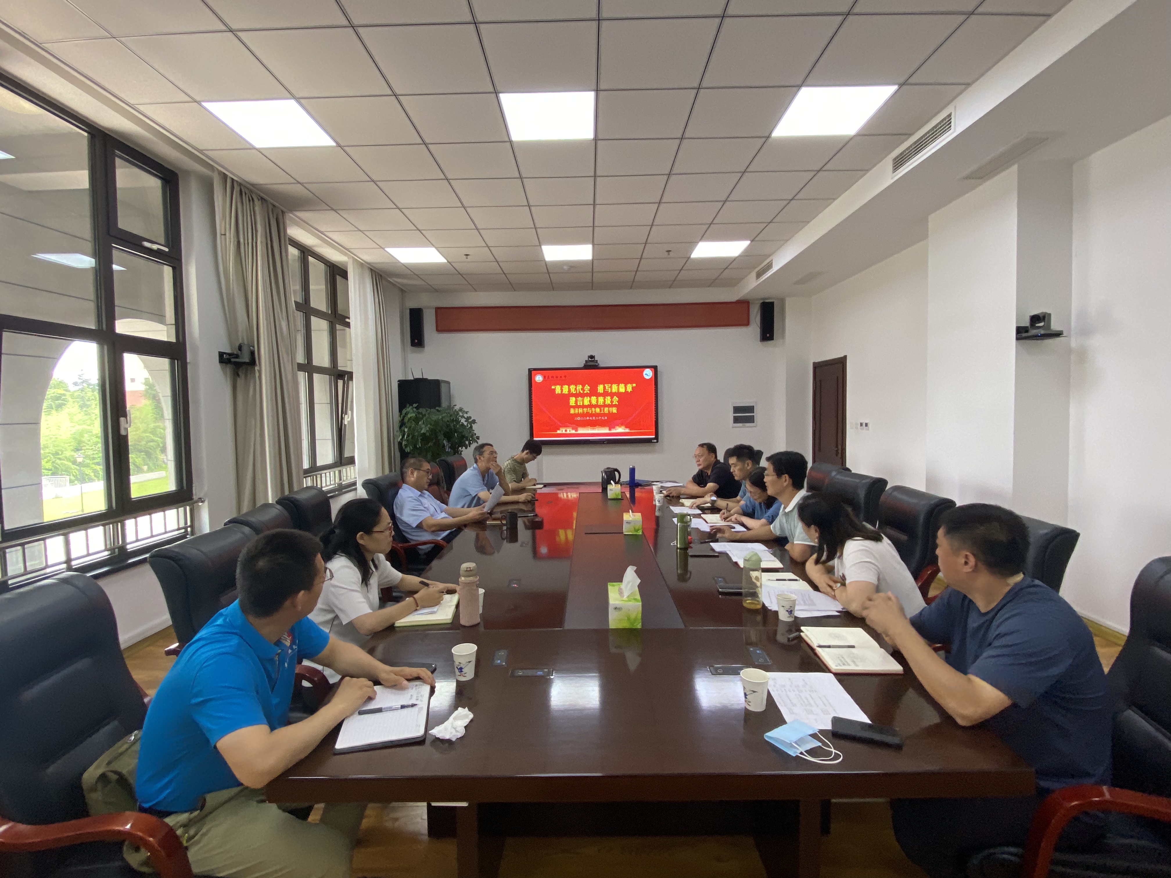 7月29日下午,公司党委常委、副董事长李志波在崂山校区综合服务楼2015会议室牵头召开“喜迎党代会 谱写新篇章”建言献策座谈会。会议由海洋公司党总支书记周宪锋主持。