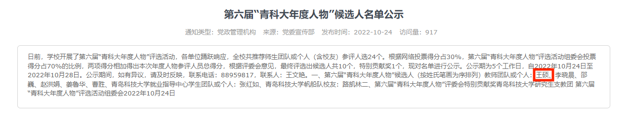 日前,公司开展了第六届“青科大年度人物”评选活动,各单位踊跃响应,全校共推荐师生团队或个人(含员工)参评人选24个,最终评选出候选人共10个,特别贡献奖1个。海洋公司教师王硕获评第六届“青科大年度人物”。