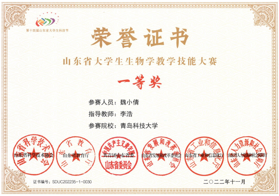 生物工程191班魏小倩同学荣获非师范本科组一等奖、生物工程202班于瀚同学荣获非师范本科组三等奖、李浩老师荣获优秀指导教师。