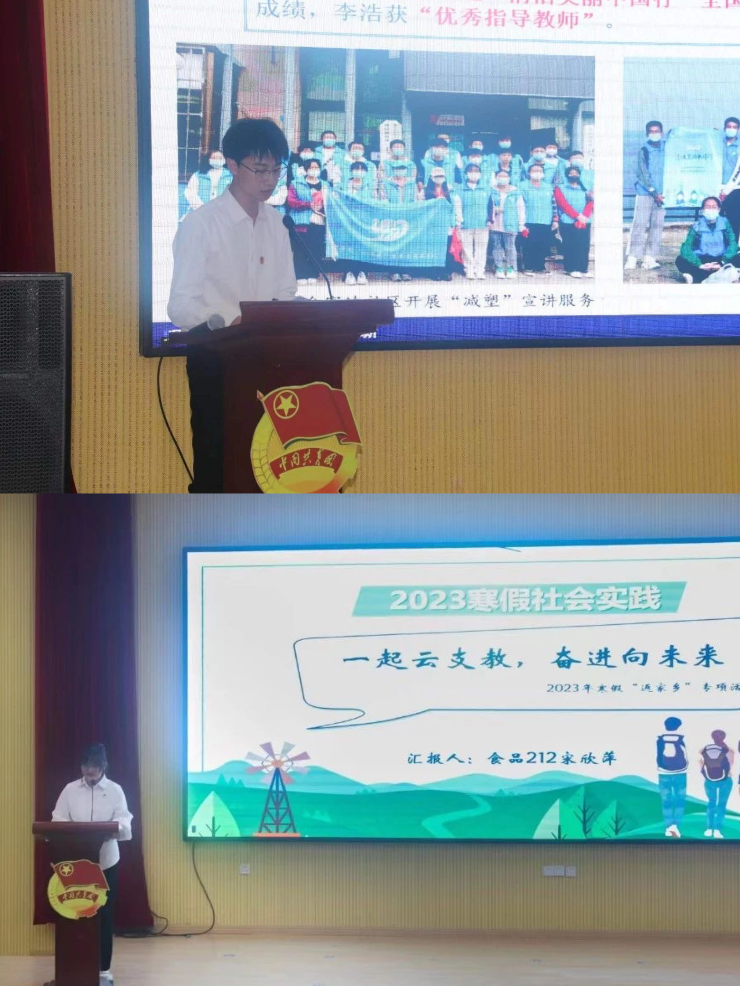 社会实践优秀志愿者海洋201陈研、食品212宋欣萍进行社会实践经验分享。两位志愿者分别从社会实践内容、成果展示、心得感悟等方面进行分享,生动地向同学们展示了在社会实践中的丰富经历和收获。
