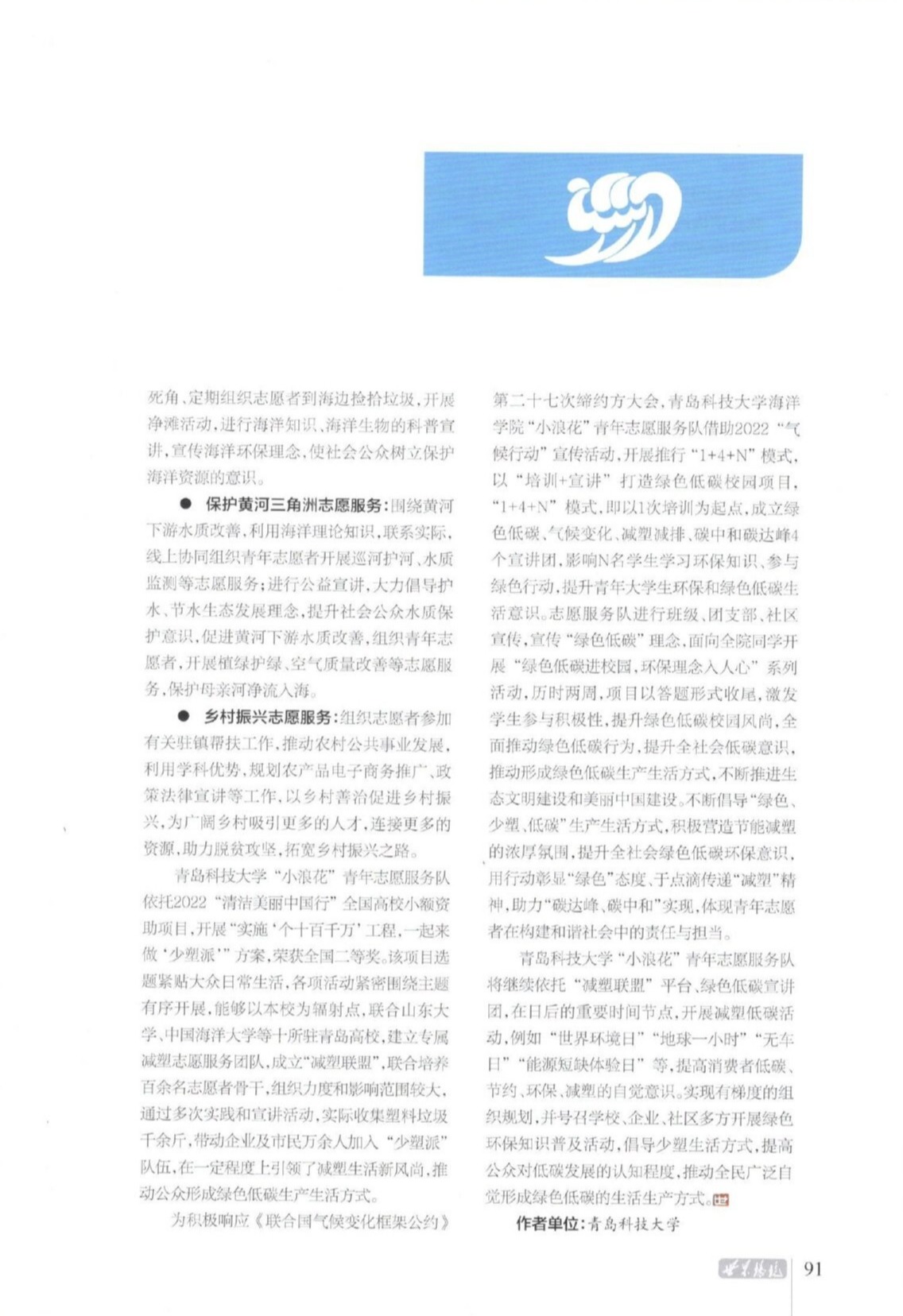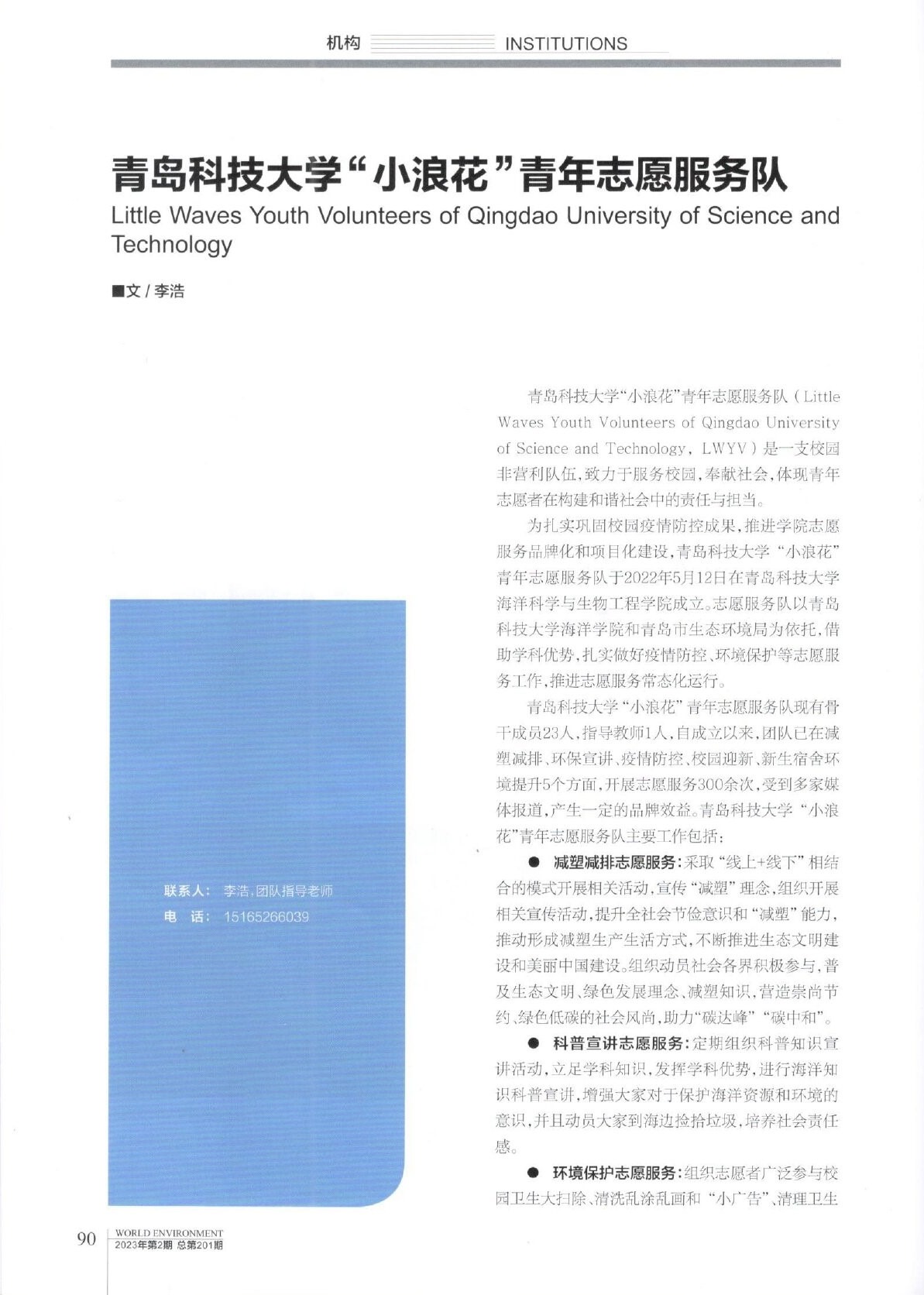 近期,《世界环境》杂志专题报道海洋公司“小浪花”青年志愿服务队。