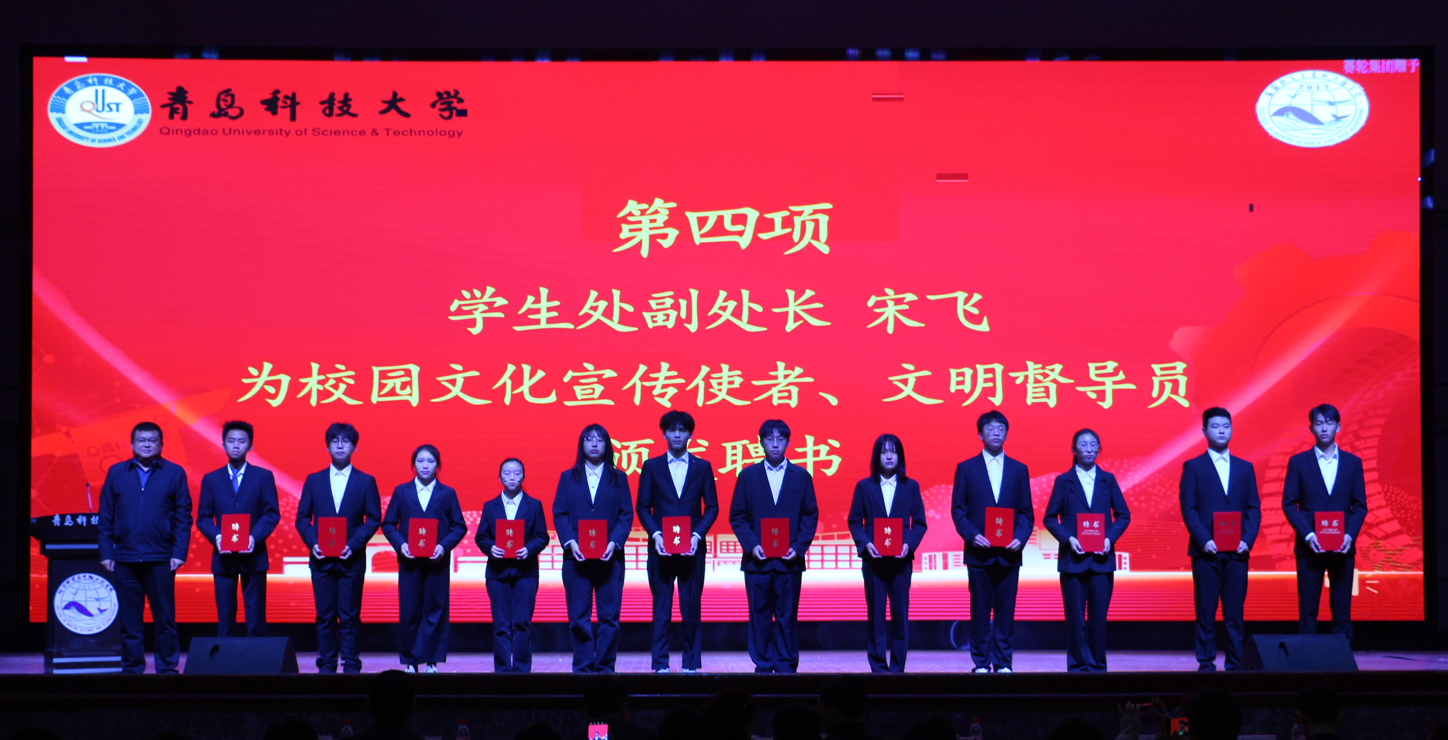 孟祥民宣读了公司校园文化宣传使者、文明督导员名单,宋飞为他们颁发聘书。