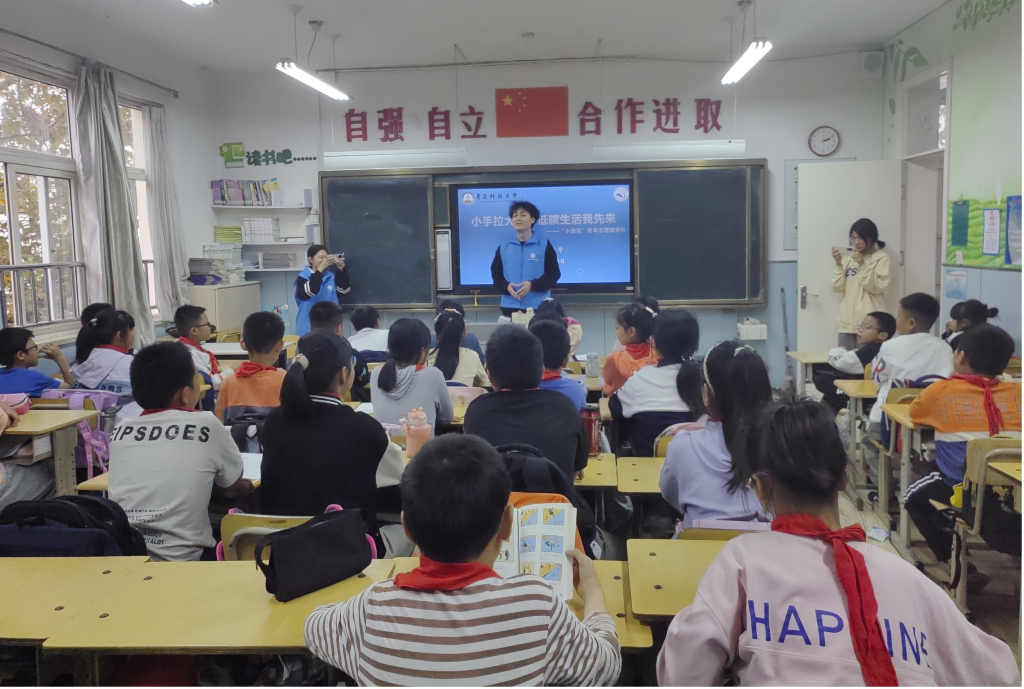 2023年11月3日,海洋公司“小浪花”青年志愿服务队前往青岛市市北区郑州路小学展开“低碳”宣讲活动。此次活动由2021级辅导员吕珊珊带队。