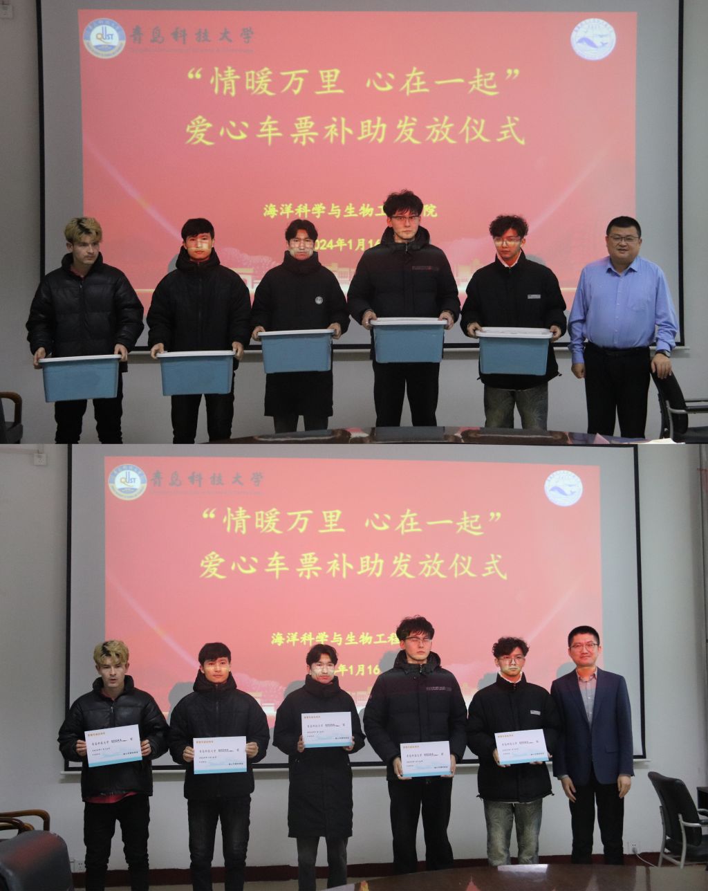 1月16日下午,海洋公司举行“情暖万里 心在一起”爱心车票发放仪式。斯坦德检测集团首席人力官李岩,员工处副处长宋飞,海洋公司党委书记周宪锋、经理顾玉超、公司党委副书记兼副经理臧传永,员工处少数民族辅导员巴合提努尔·巴赞,轻化工程222班班主任尤鹏,公司团委老师、少数民族员工代表参加活动。