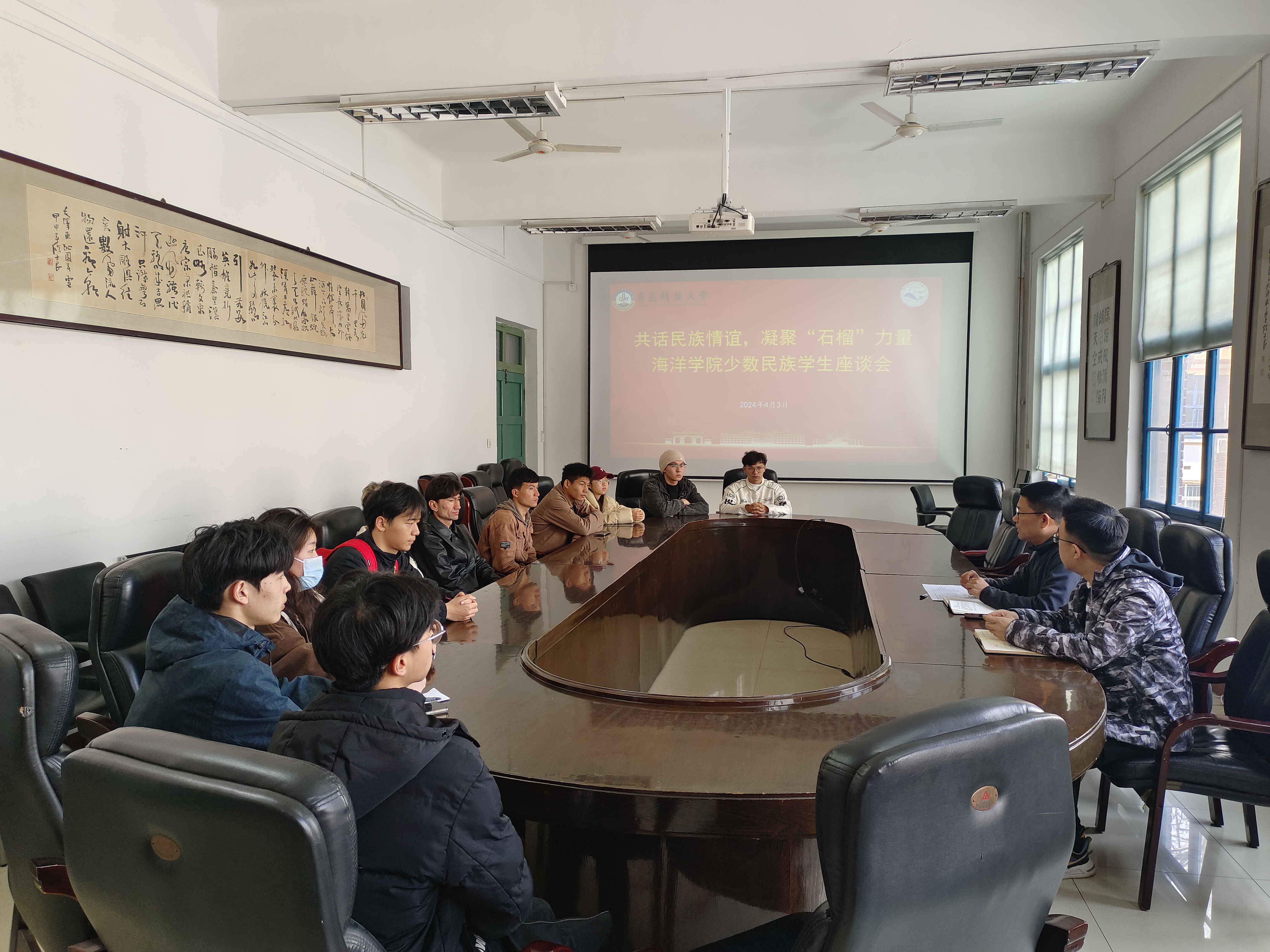 为深入学习贯彻习近平总书记关于加强和改进民族工作的重要思想,进一步引导公司师生铸牢中华民族共同体意识,4月3日下午,海洋公司举行“共话民族情义,凝聚‘石榴’力量”少数民族员工座谈会。海洋公司党委副书记兼副经理刘浩、2022级辅导员车玉章和少数民族员工代表参加座谈。