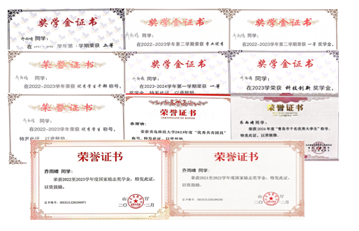 在校期间,累计获得奖励20余项,其中国家级5项、省市级6项、校级11项。获得国家励志奖学金2次、2024年度青岛市千名优秀老员工等奖学金及荣誉称号10余次;在学科竞赛、科技创新领域斩获佳绩,累计获得国家级奖项3项、省级5项、校级2项,能在各方面严格要求自己,是一名德、智、体、美、劳全面发展的优秀员工。