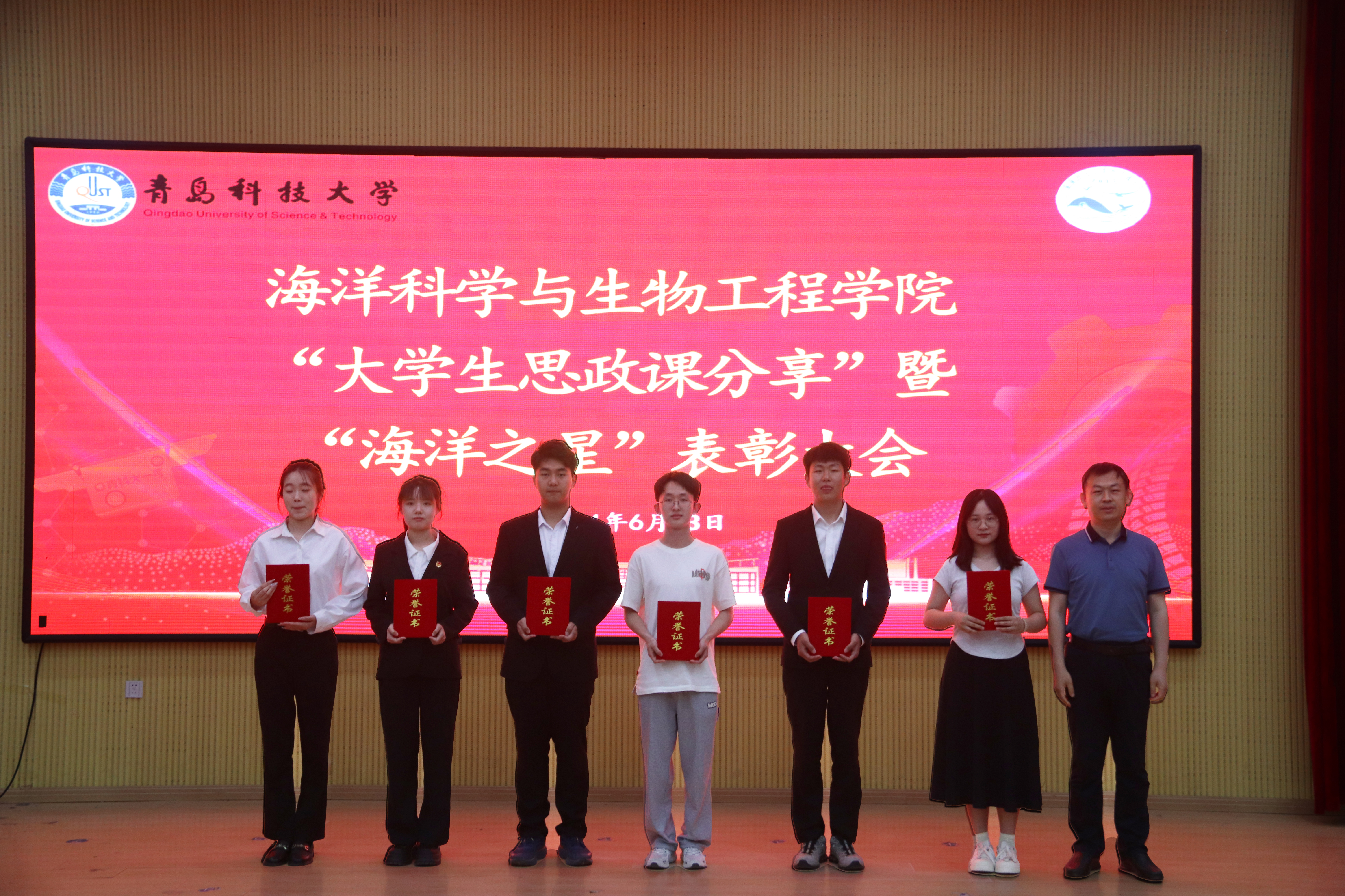 为进一步表彰先进、树立典型,凸显新时代青年蓬勃朝气,6月13日,海洋公司于四方校区讲学厅举办“老员工思政 V 课分享”暨“海洋之星”表彰大会,海洋公司党委副书记兼副经理刘浩、团委书记兼学工办主任秦洪庆、团委副书记兼学工办副主任刘金岭、团委全体老师、2023级全体团干部和员工代表参加活动。