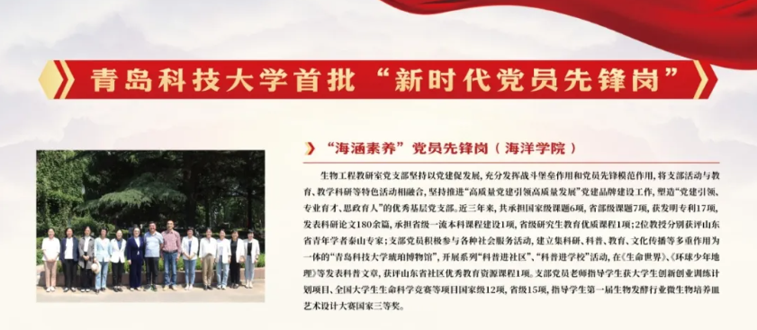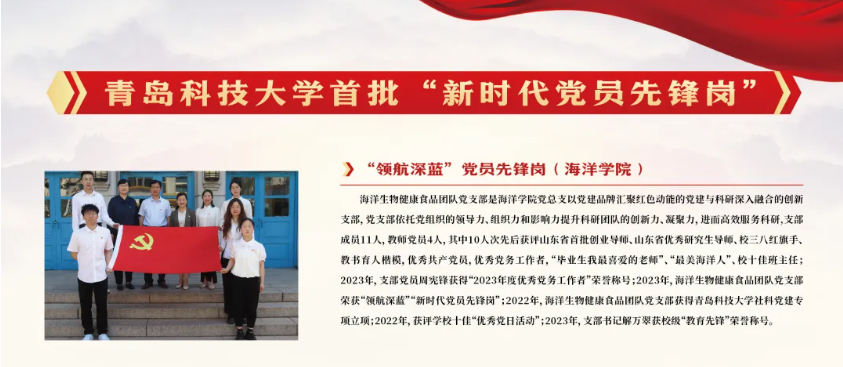 此外,在公司首批“新时代党员先锋岗”评选中,生物工程教研室党支部“海涵素养”党员先锋岗获评公司教书育人党员先锋岗,海洋生物健康食品团队党支部“领航深蓝”党员先锋岗获评公司科研攻关党员先锋岗。