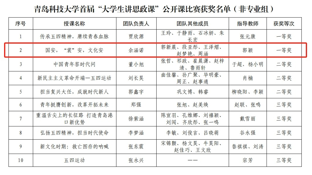 近日,公司首届“老员工讲思政课”公开课比赛结果公布。由佘涵诺、段亚彤、郭新晨、赵梦艳、王泽熠、周涵共同创作的《国安,“裳”安,文化安》在现场评审中获得一等奖第一名的成绩。