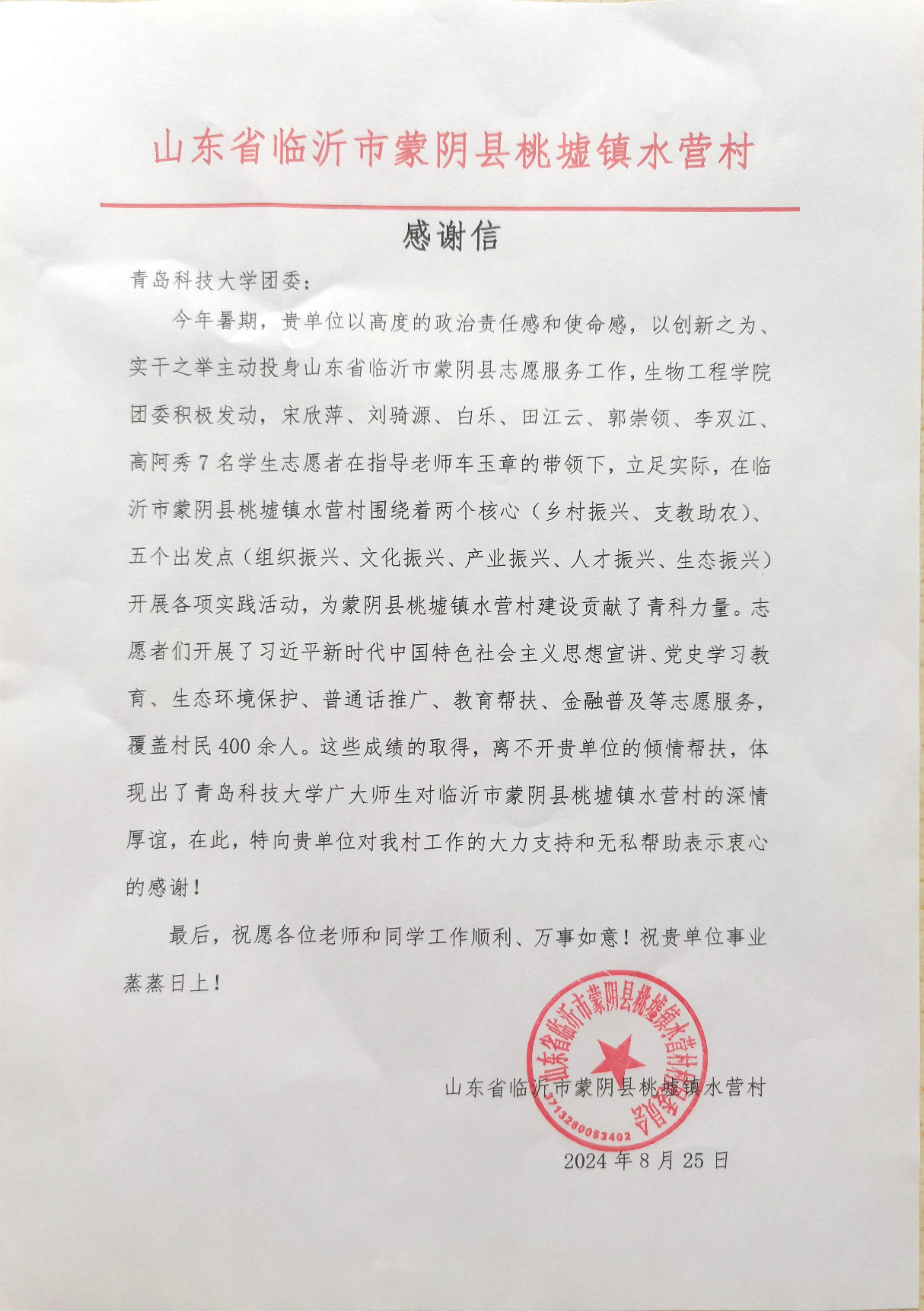 为深入学习贯彻习近平新时代中国特色社会主义思想和党的二十大精神,学习习近平总书记五四青年节对全国广大青年寄语精神,通过社会实践坚定理想信念、站稳人民立场、练就过硬本领、投身强国伟业,7月19日至7月28日,谈球吧“山海情”调研团赴临沂市蒙阴县开展暑期社会实践活动。活动过程中,团队成员的优秀表现得到了山东省临沂市蒙阴县桃墟镇水营村的高度赞扬,并发来感谢信。