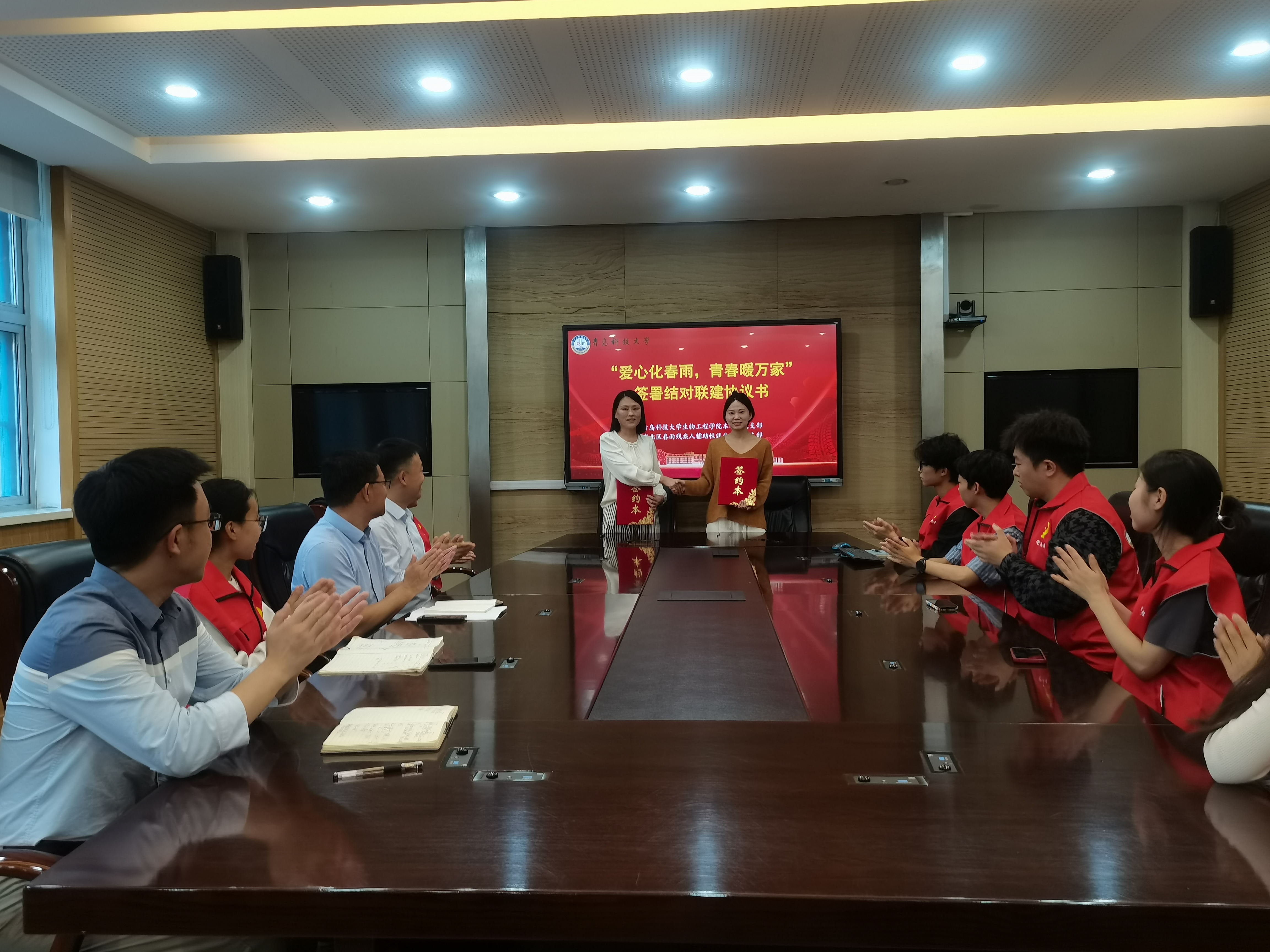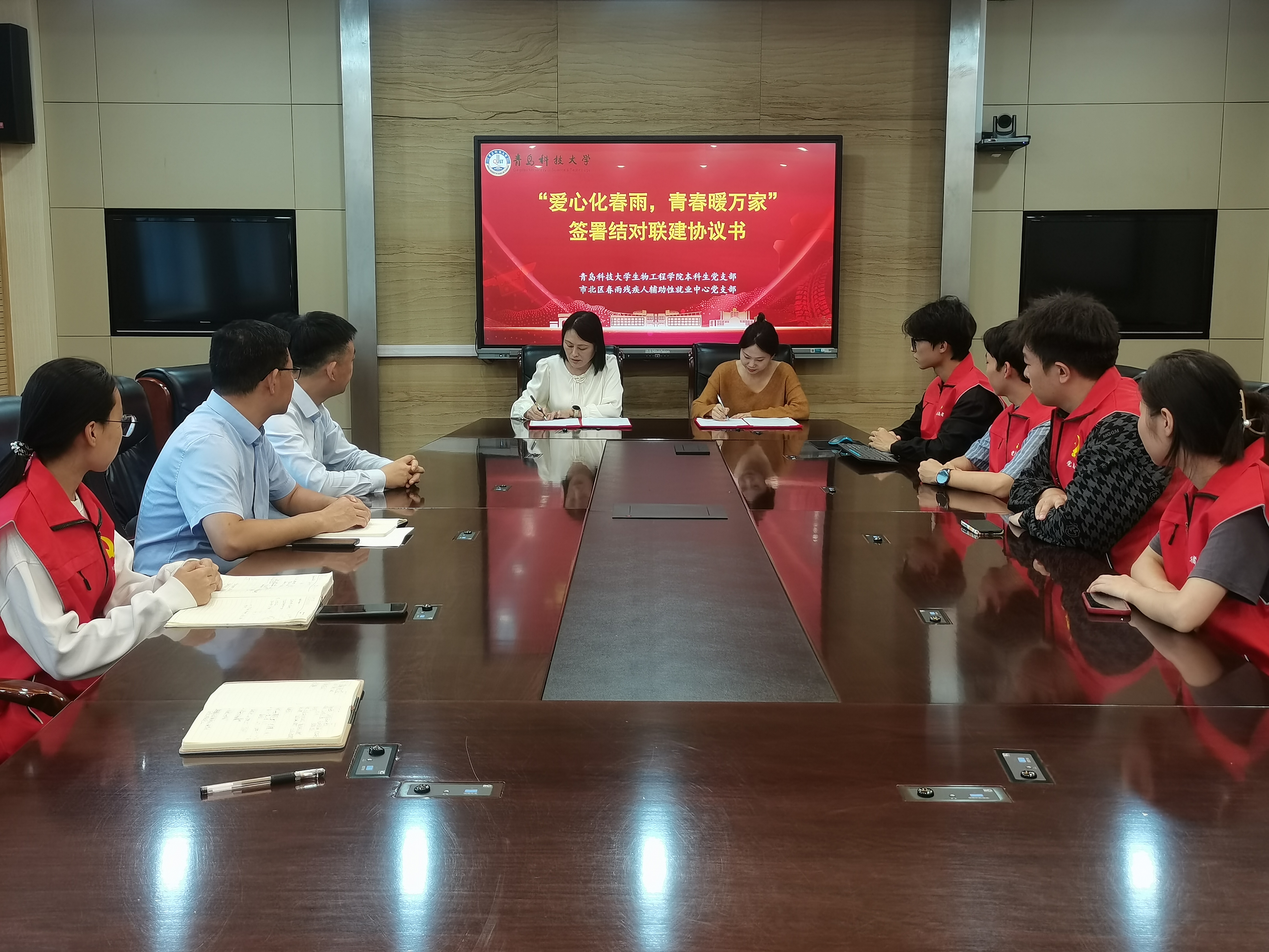 会上,周海妮、郭颖签订“爱心化春雨,青春暖万家”结对联建协议书。
