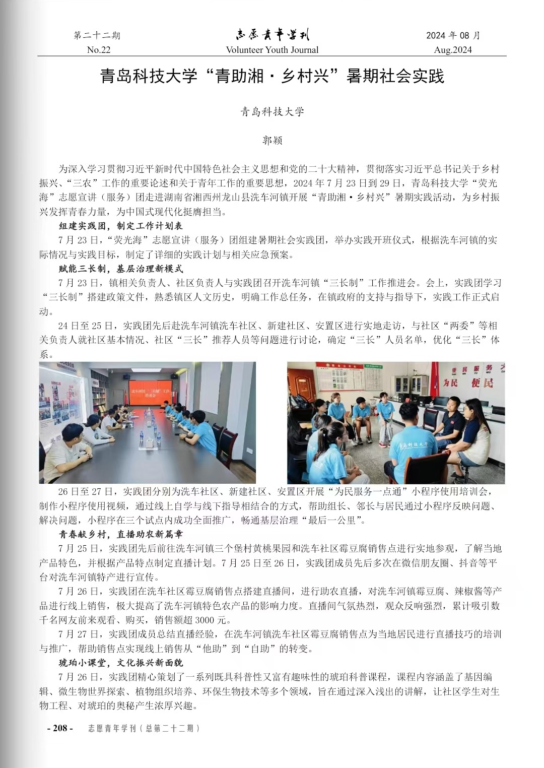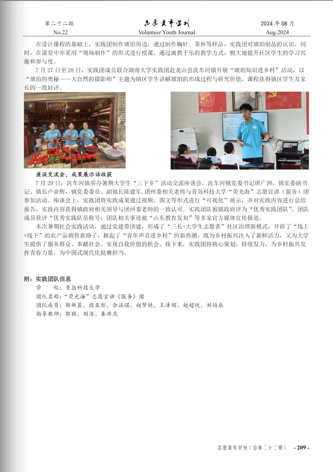 近期,由《志愿青年学刊》编辑部开展的2024年暑期“三下乡”社会实践专刊(上辑-活动纪实;2024年8月刊;总第二十二期)征稿审稿录用工作已完成。谈球吧由刘浩、秦洪庆、郭颖老师指导的《谈球吧网页版登录入口“青助湘·乡村兴”暑期社会实践》一文通过编委会审核,已于《志愿青年学刊》2024年暑期“三下乡”社会实践专刊(上辑-活动纪实)发表。