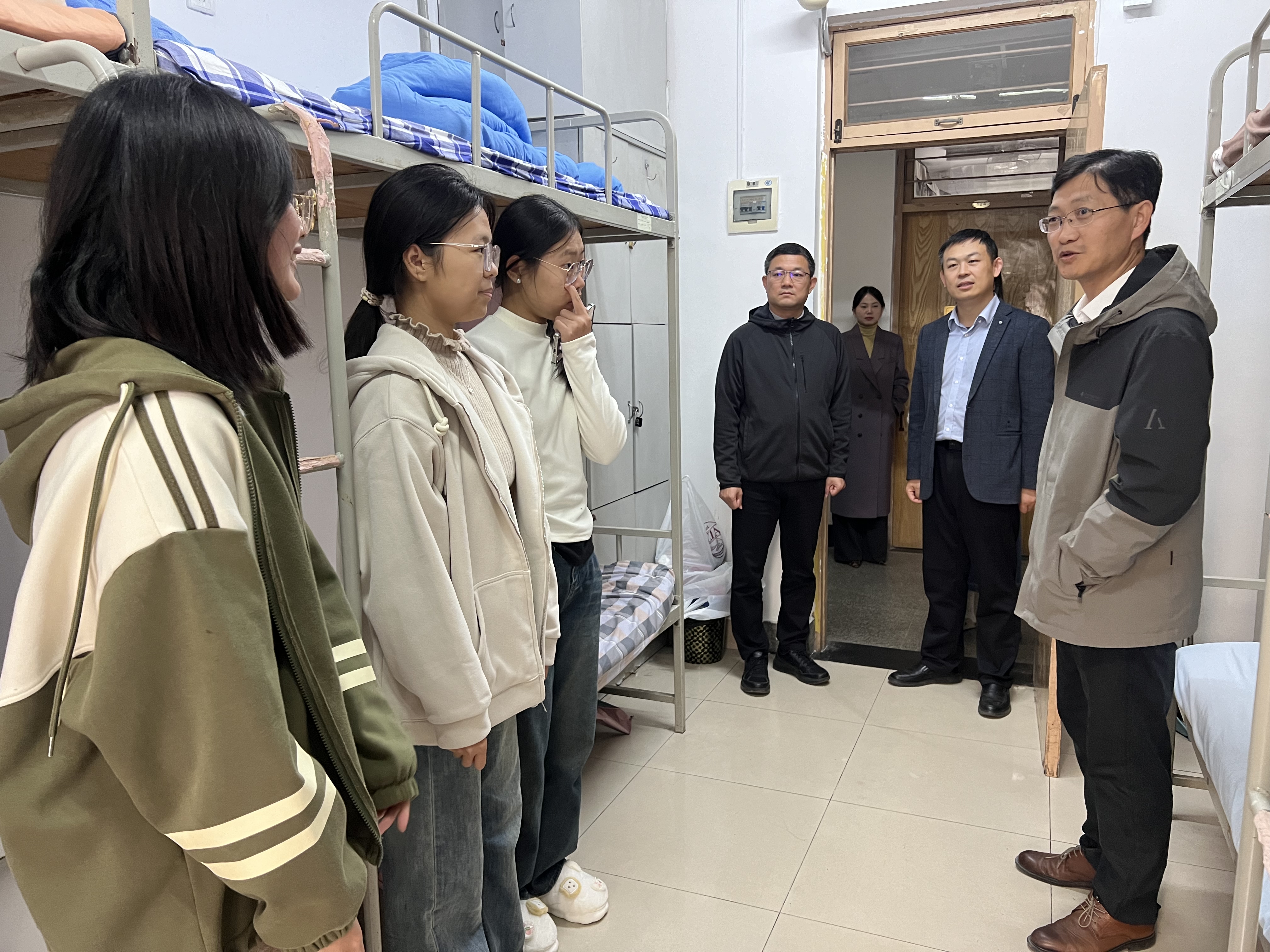 在走访活动中,领导和老师们深入员工生活一线,与同学们展开了温馨而亲切的交流,鼓励他们继续维护并提升良好的学习氛围。期间,他们细致入微地检查了宿舍的内务整理情况、用电用水安全及卫生状况,对内务井井有条、整洁规范的宿舍给予了高度评价与表扬。同时,领导和老师们也温馨提醒同学们需适时调整个人生活状态,激励大家培养积极向上的生活态度,自觉践行勤俭节约、文明安全的日常习惯。