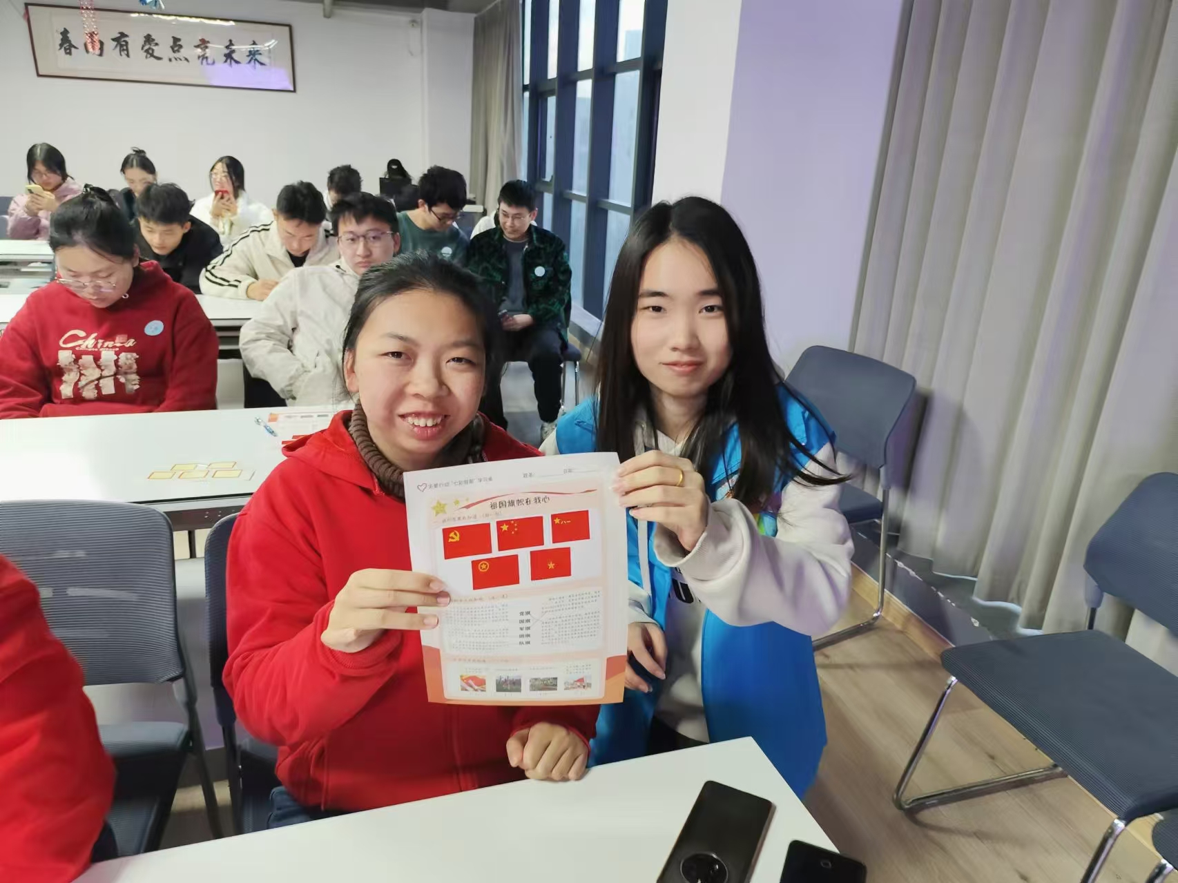 课堂上,志愿者以生动易懂的方式向孩子们传授爱国主义文化知识,深入浅出的讲解让孩子们沉浸其中,对祖国有了更为深刻的认识与强烈的认同感。随后,在“旗帜在我心中”贴一贴、连一连的互动环节里,残障孩子们在志愿者的协助下积极参与,通过对旗帜图案的认知与连接,加深了对国家象征的理解。活动末尾,孩子们纷纷写下想对祖国和老员工志愿者们说的话,这些文字不仅是孩子们内心的真情流露,更见证了此次志愿服务活动在他们心中种下的希望与信念的种子。