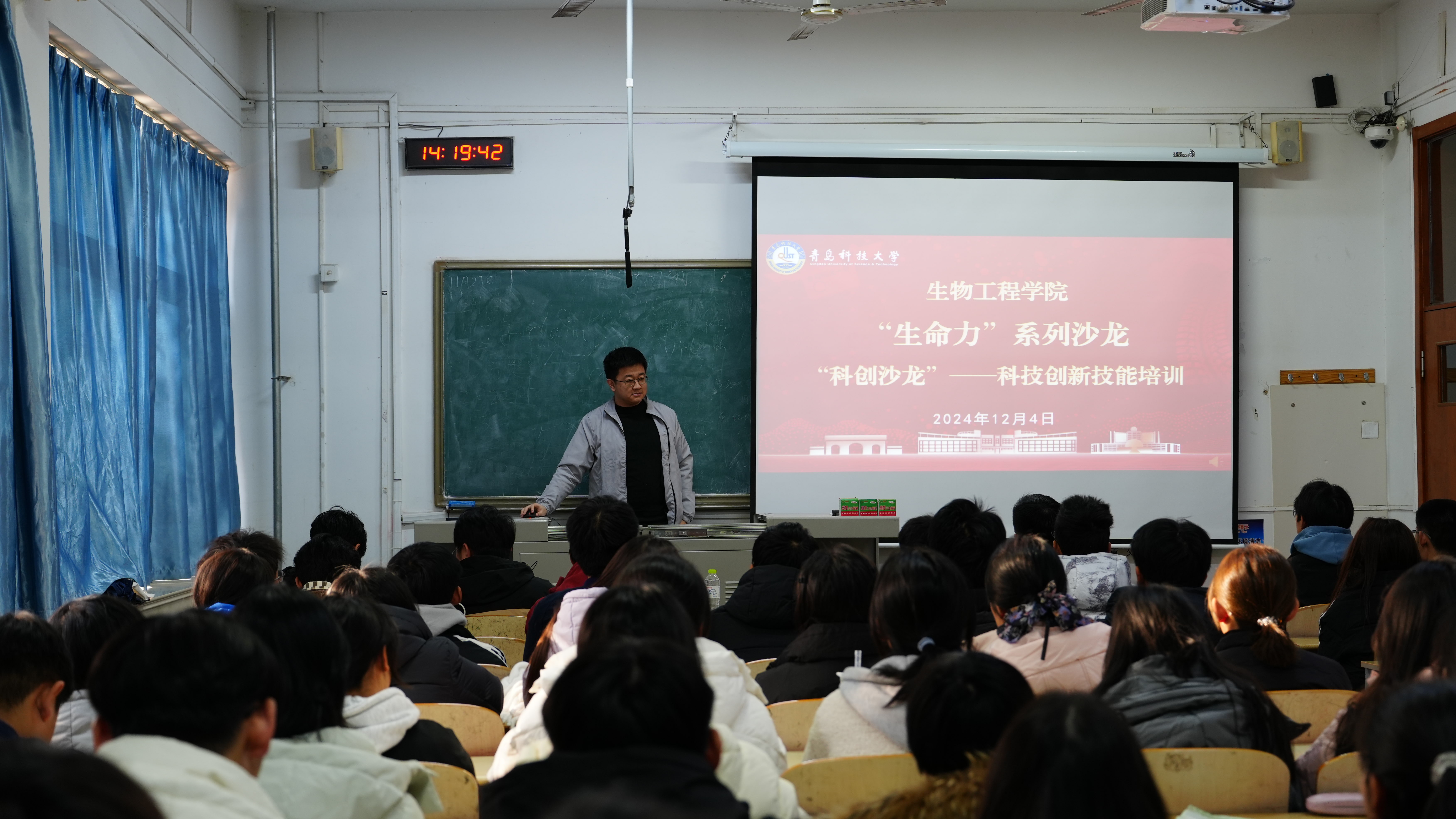 随后,杨奉儒为同学们详细讲解了挑战杯赛事的具体内容和参赛要点,他结合自己指导挑战杯项目的经验,详细阐述了项目选题、方案设计、实验验证和答辩准备等各个环节的注意事项和技巧。同时,他还通过生动的案例和具体的数据,让同学们更加直观地了解了挑战杯赛事的参赛流程和评分标准,激发了同学们对参与科研创新的信心与动力。