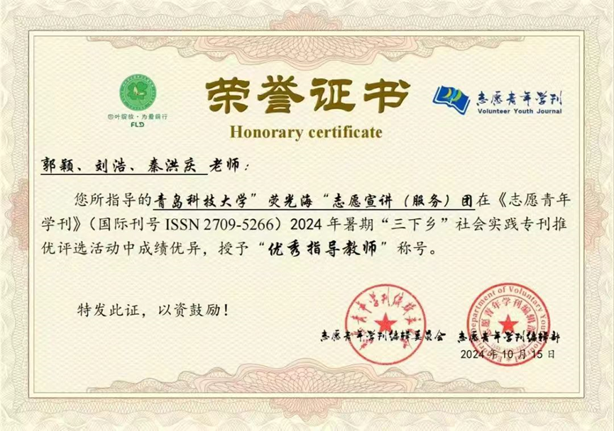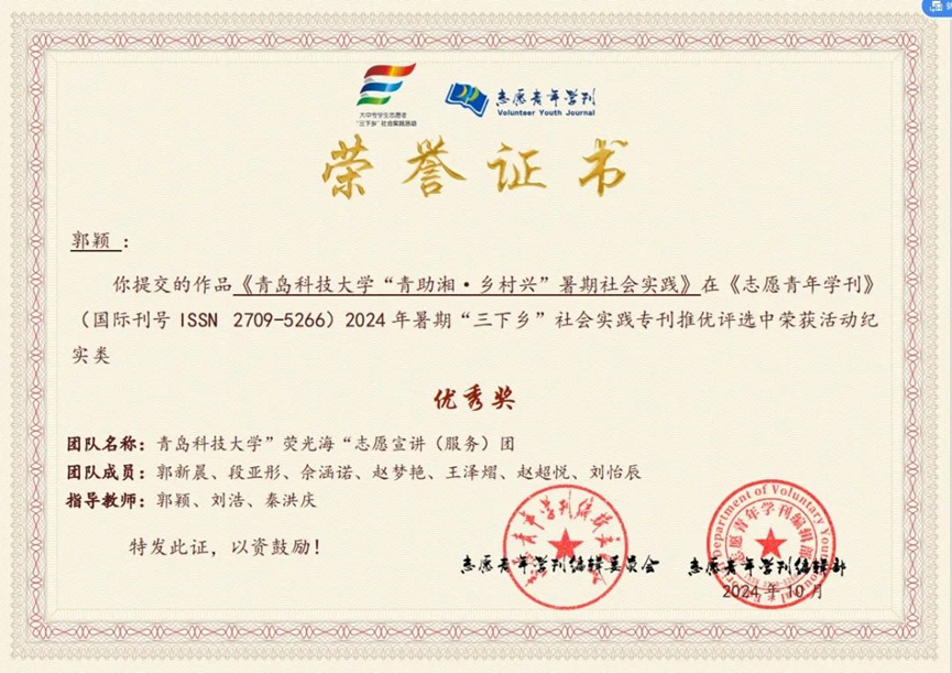 10月15日,谈球吧“荧光海”志愿宣讲(服务)团在《志愿青年学刊》(国际刊号ISSN 2709-5266)举办的2024年暑期“三下乡”社会实践专刊稿件推优评选活动中荣获优秀奖;郭颖、刘浩、秦洪庆荣获优秀指导教师。