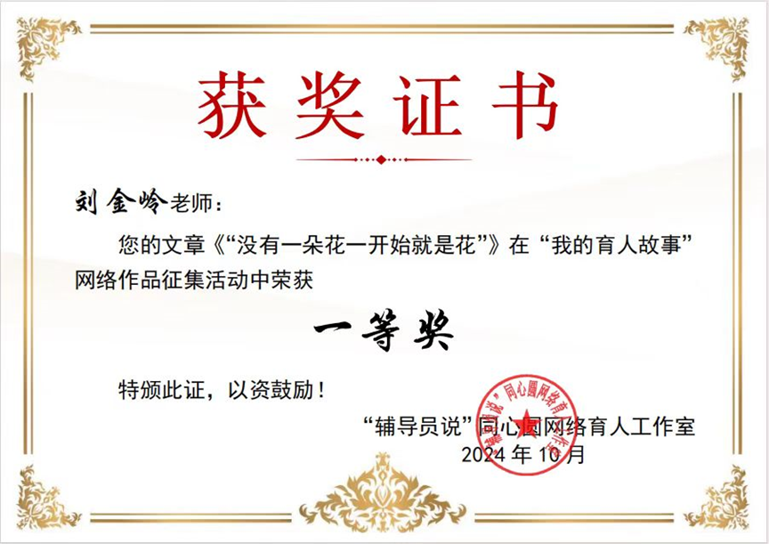 2024年10月,“辅导员说”同心圆网络育人工作室公布了“我的育人故事”“我与辅导员的故事”思政网文作品征集活动获奖名单。经过一系列评选,“我的育人故事”序列最终评选出特等奖2名,一等奖3名,二等奖4名,三等奖7名,优秀奖8名。公司辅导员刘金岭的育人故事《没有一朵花从一开始就是花》荣获一等奖。