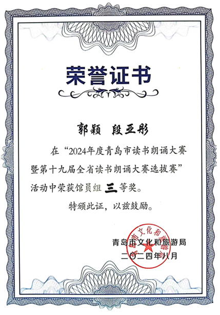 8月22日,青岛市成功举办2024年度青岛市读书朗诵大赛暨第十九届全省读书朗诵大赛选拔赛馆员组比赛,大赛由青岛市文化和旅游局主办,各区(市)文化和旅游局、青岛市图书馆承办,各区(市)图书馆联合协办。公司教师郭颖、海洋231班员工段亚彤共同创作的作品《离书最近的人》荣获青岛市三等奖。
