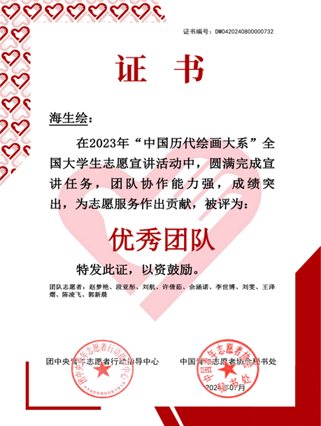 2024年8月,团中央青年志愿者指导行动中心、中国青年志愿者协会公布了100支2023年“中国历代绘画大系”全国青年员工志愿宣讲活动优秀团队名单。谈球吧团委由郭新晨、段亚彤、佘涵诺、赵梦艳、王泽熠、李世博、刘雯、刘航、许倩茹、陈凌飞十名同学组成的“海生绘”志愿宣讲团从1000支宣讲团队中脱颖而出,荣获全国“优秀团队”荣誉称号。