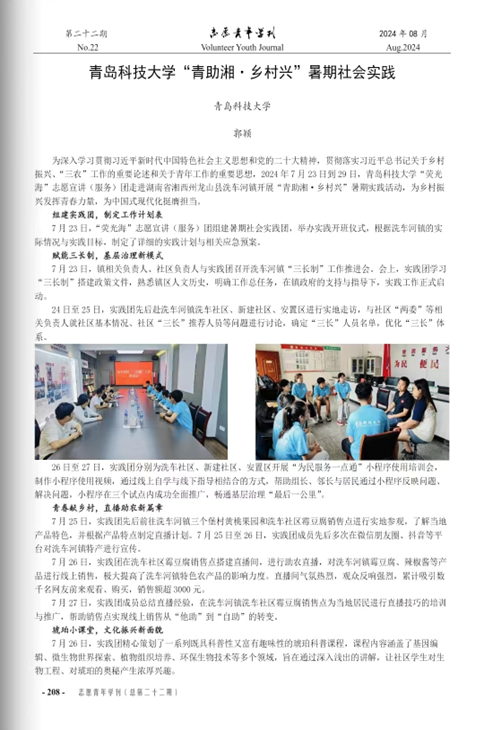 10月,由《志愿青年学刊》编辑部开展的2024年暑期“三下乡”社会实践专刊(上辑-活动纪实;2024年8月刊;总第二十二期)征稿审稿录用工作已完成。谈球吧由刘浩、秦洪庆、郭颖老师指导的《谈球吧网页版登录入口“青助湘·乡村兴”暑期社会实践》一文通过编委会审核,已于《志愿青年学刊》2024年暑期“三下乡”社会实践专刊(上辑-活动纪实)发表。