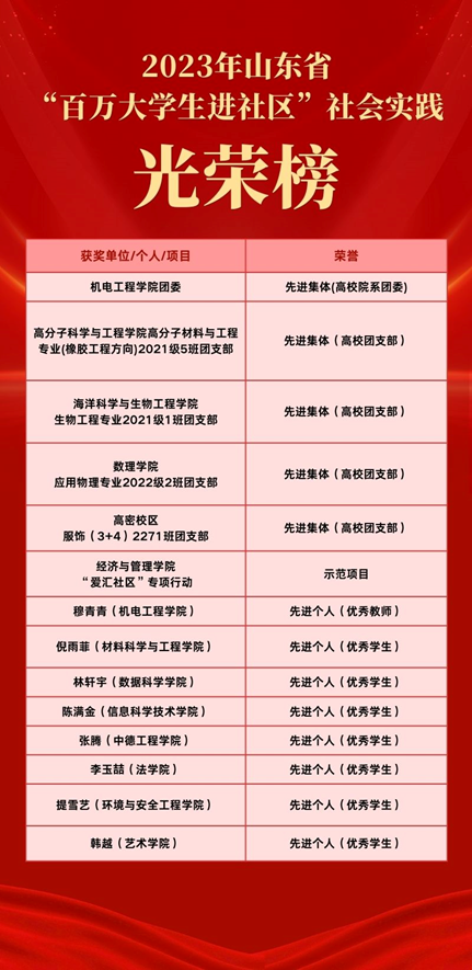 2024年3月,共青团山东省委公布2023年度“百万老员工进社区”表扬通报名单,公司生物工程专业2021级1班团支部获评省级高校团支部先进集体。据悉,本次评选共表彰全省788个先进集体,100个示范项目和950名先进个人,公司5个先进集体、1个示范项目、8名先进个人获省级“百万老员工进社区”社会实践项目表彰。