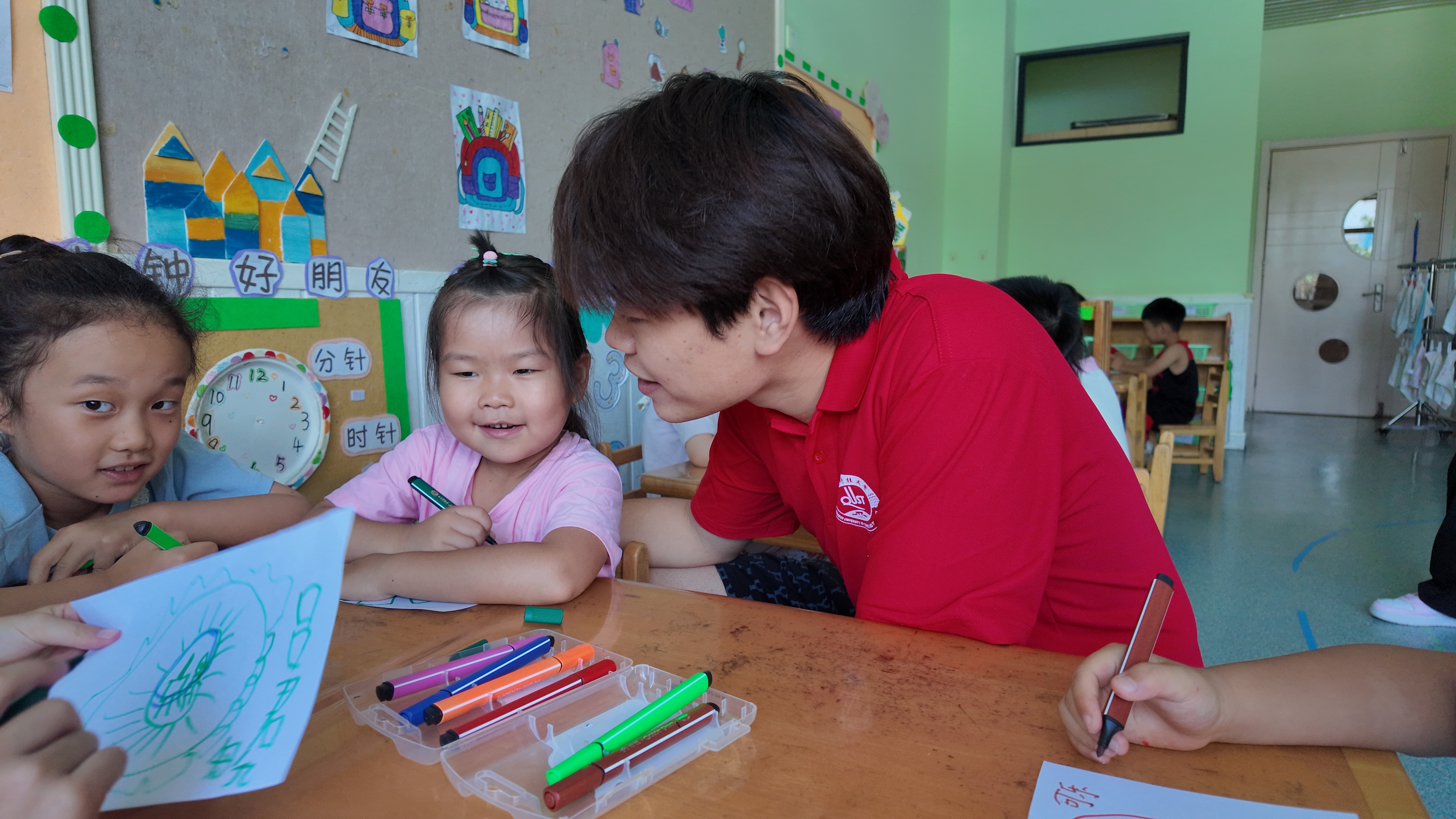 活动间隙,志愿者团队召开简短座谈会。结合海洋科学专业特色,提出将海洋生物认知、大气环流小实验等内容融入后续活动的初步构想,通过沟通让知识传递更贴合幼儿认知特点,更显生动有趣。