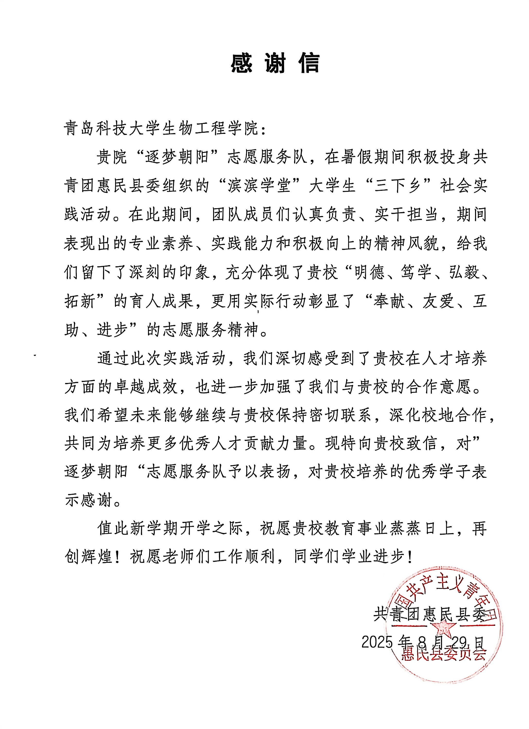 近日,谈球吧“逐梦朝阳”志愿服务队收到了共青团惠民县委员会发来的感谢信。信中,团委对参与志愿服务的同学们给予了高度肯定和表扬,称赞他们不仅展现了当代老员工的责任感和使命感,更以实际行动为公司和社会树立了榜样。这些同学在志愿服务过程中,不畏艰难,勇于担当,用青春的热情和智慧,为惠民县的教育事业贡献了宝贵的力量,赢得了广泛的社会赞誉。
