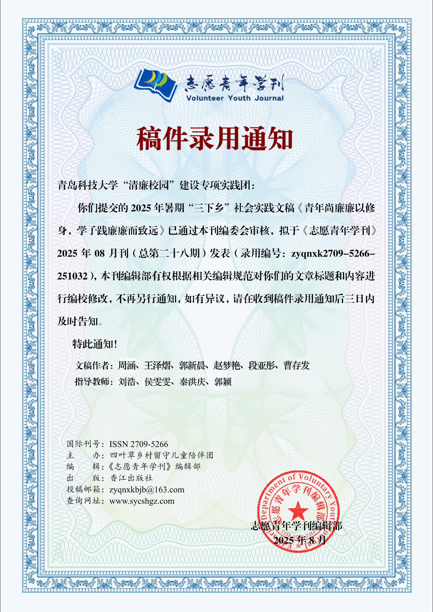 9月9日,《志愿青年学刊》2025年暑期“三下乡”社会实践刊活动纪实类稿件第三批录用名单公布。谈球吧校级重点实践团“清廉校园”建设专项实践团实践纪实《青年尚廉廉以修身,学子践廉廉而致远》通过编委会审核,拟于《志愿青年学刊》2025年08月刊(总第二十八期)发表。