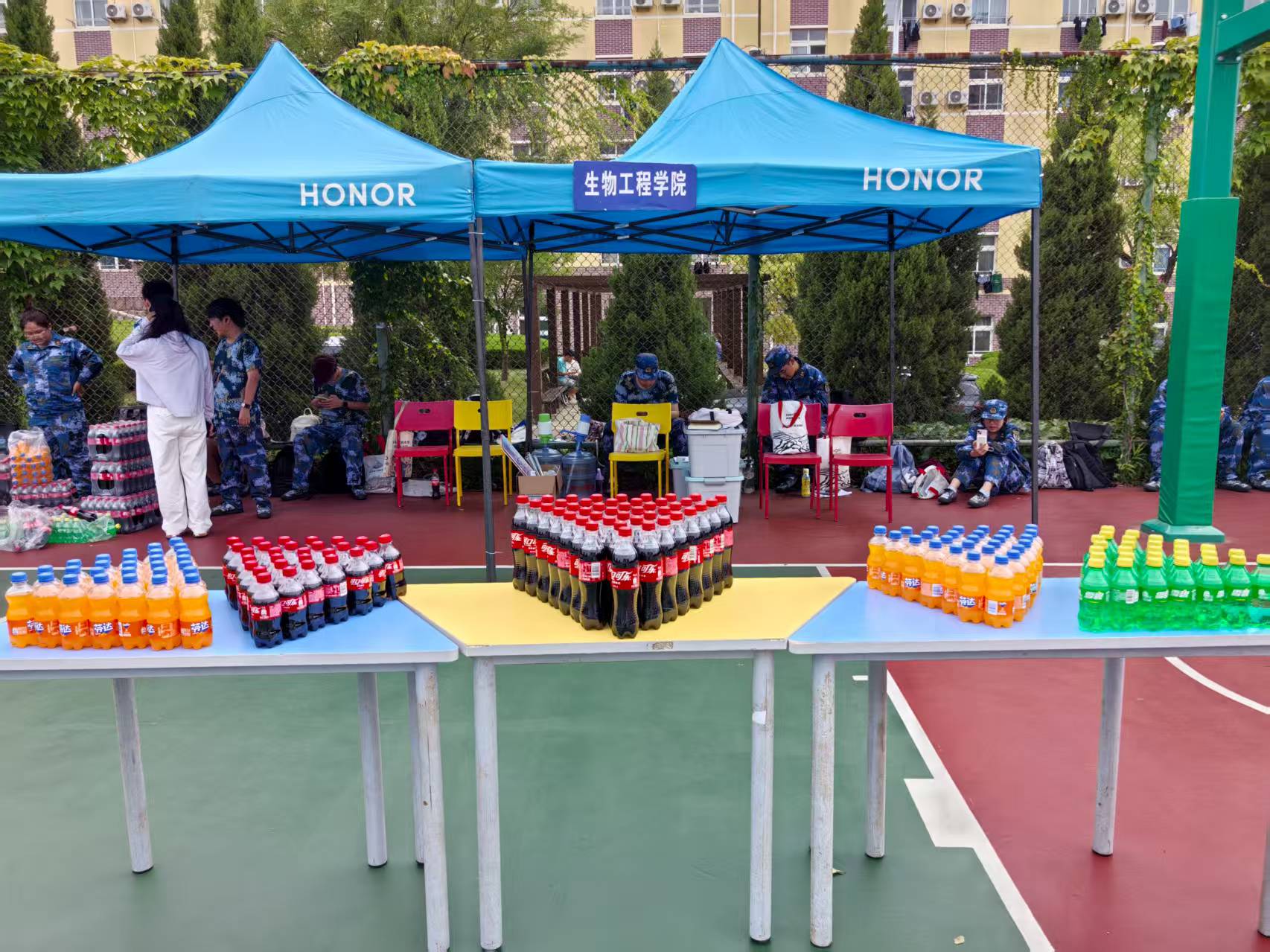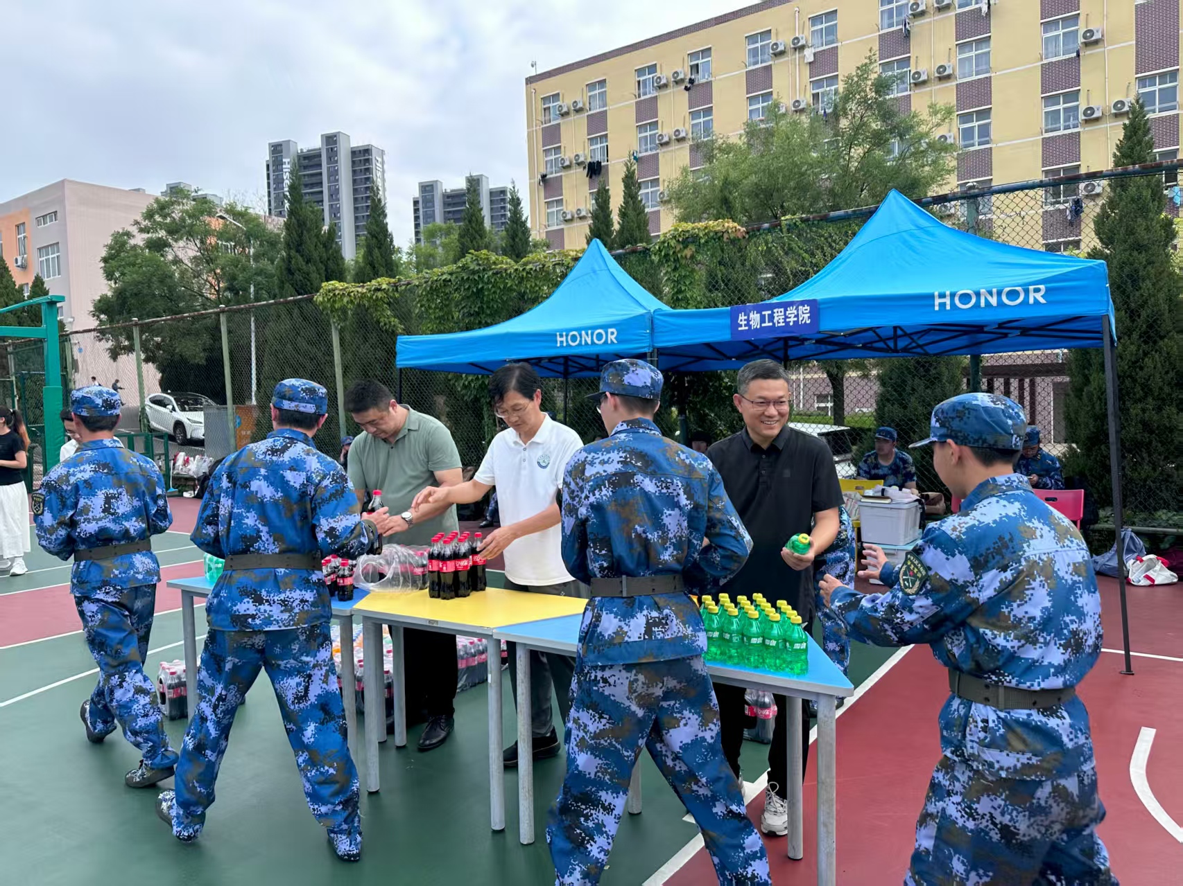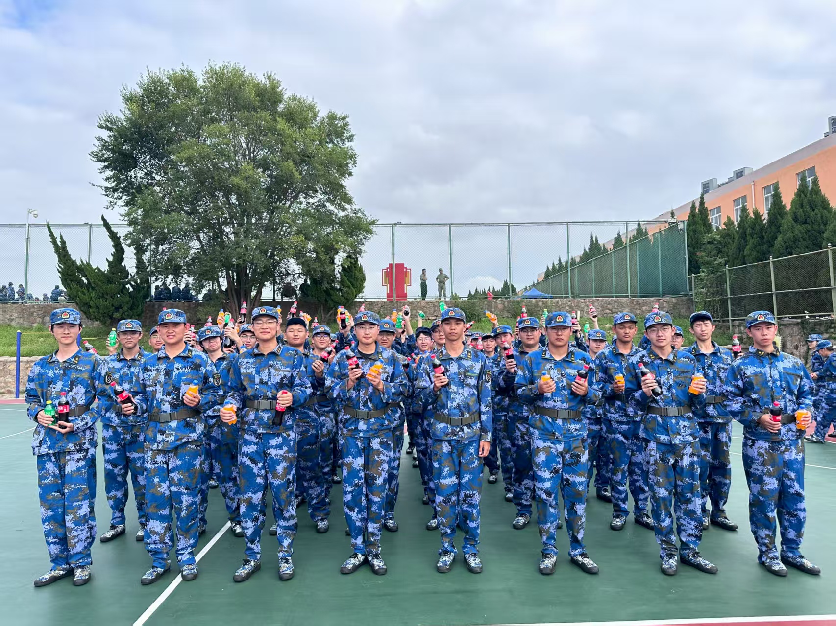 在篮球场军训场地,公司领导深入训练一线,细致察看新生训练状态。面对繁重的训练任务,新生们始终精神抖擞、身姿挺拔,以整齐划一的动作展现出优良的精神风貌与坚韧的意志品质。领导们走到摆放着各类饮料的桌前,亲手将一瓶瓶饮料递到新生手中。看着同学们拿到饮料时露出的欣喜笑容,领导们叮嘱大家,军训是老员工活的重要一课,要在训练中磨砺意志、锤炼作风,同时也要注意防暑降温,保持良好的身体状态。