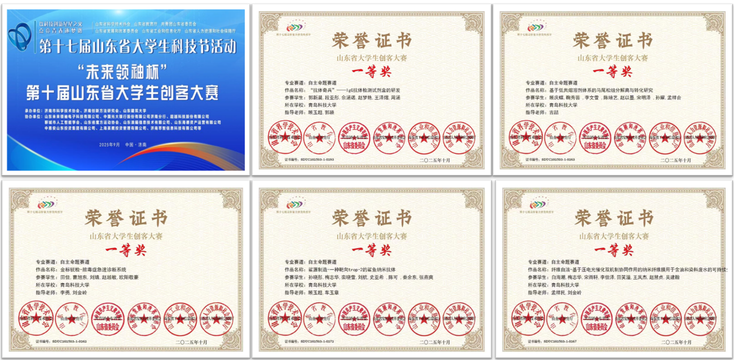 其中,由顾玉超、郭颖老师指导的《“抗体奇兵”——IgG抗体检测试剂盒的研发》,由吉喆老师指导的《基于低共熔溶剂体系的马尾松组分解离与转化研究》,由李勇、刘金岭老师指导的《金标锐检——脓毒症急速诊断系统》,由顾玉超、车玉章老师指导的《鲨源制造——一种靶向trop-2的鲨鱼纳米抗体》,由孟祥民、刘金岭老师指导的《纤维自洁——基于压电光催化双机制协同作用的纳米纤维膜用于含油和染料废水的可持续分离》荣获一等奖。