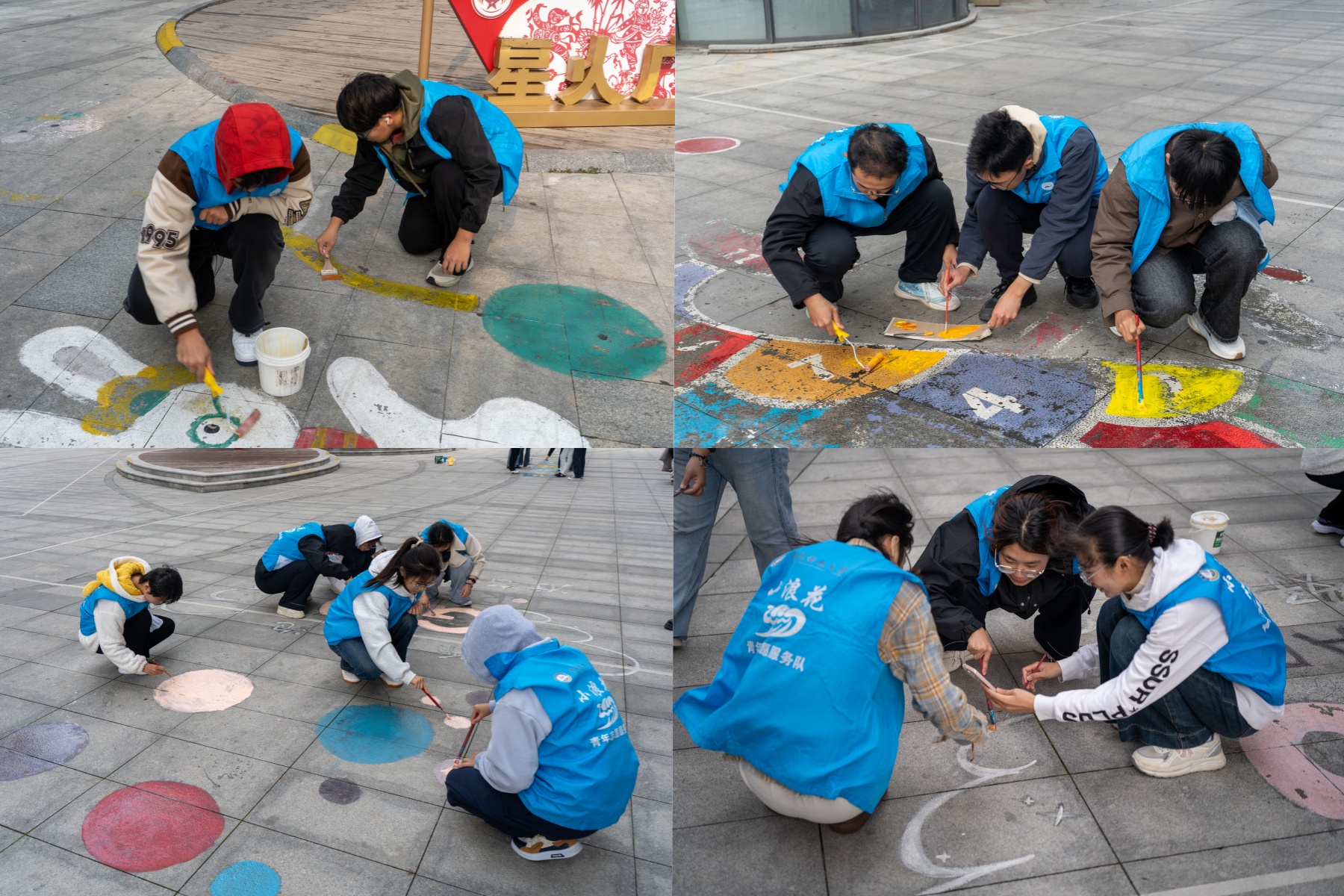 在创作过程中,志愿者们充分发挥专业特长,精心设计修补方案,围绕主题图案进行细致修复。从勾勒清晰轮廓到填充均匀色彩,每一个环节都体现出同学们的专注与用心。在色彩搭配方面,大家协同合作、积极探讨,将专业文化元素与现代审美风格有机融合,使地绘作品焕然一新。