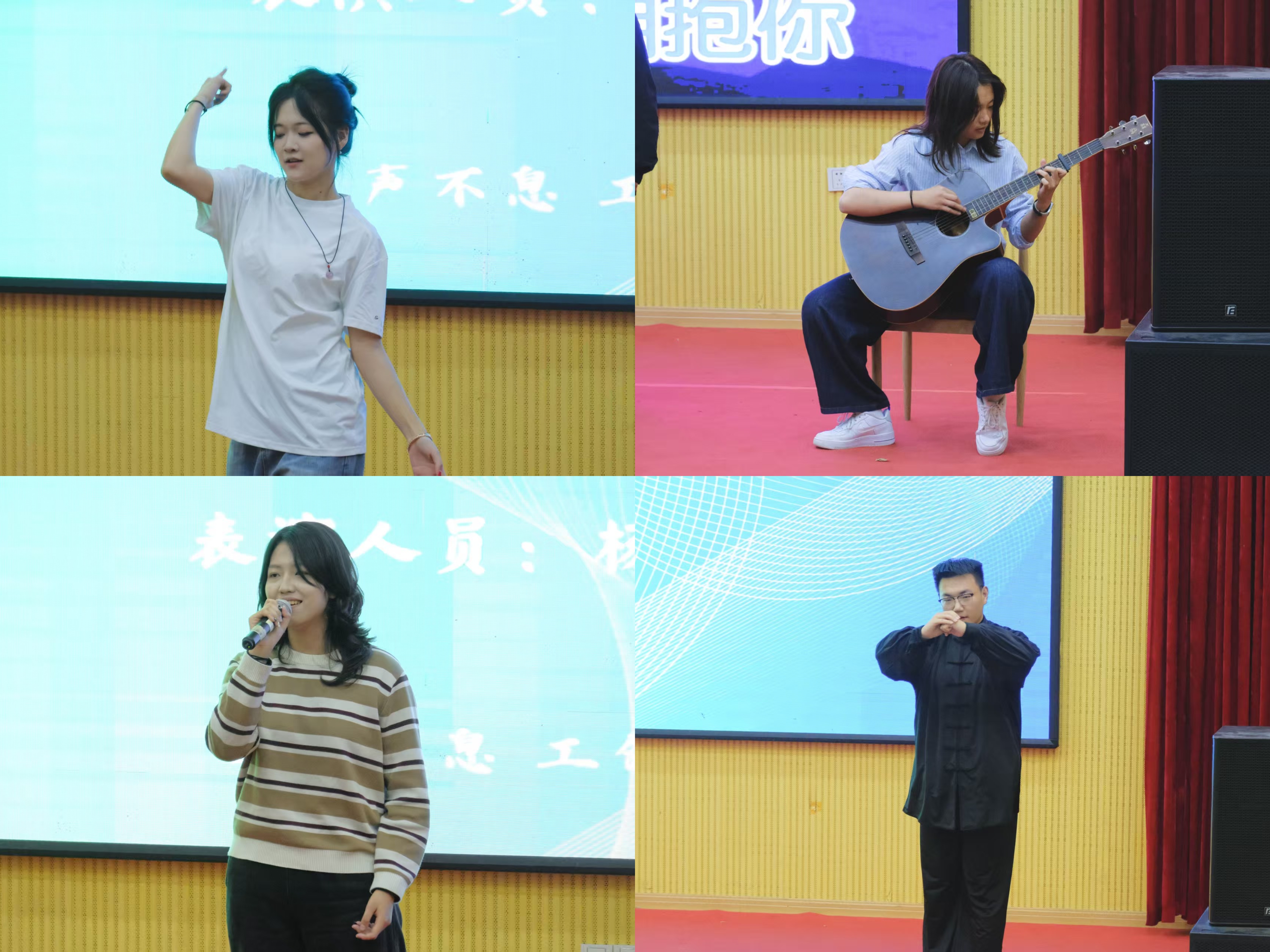 伴随主持人的精彩开场,活动正式拉开帷幕。歌舞《像你这样的朋友》率先点燃现场,《La gloire à mes genoux》《特别的人》等歌曲让观众沉醉其中;舞蹈《we go up》《失眠飞行》展现青春朝气,合唱《大东北是我的家乡》将气氛推向高潮;接下来的《夜空中最亮的星》《平凡之路》等合唱曲目,以温暖嗓音诠释坚持与希望;弹唱《勇往直前》与刚劲有力的八极拳表演,尽显青春热血。最后,活动在《晴天》的悠扬旋律中圆满落幕。