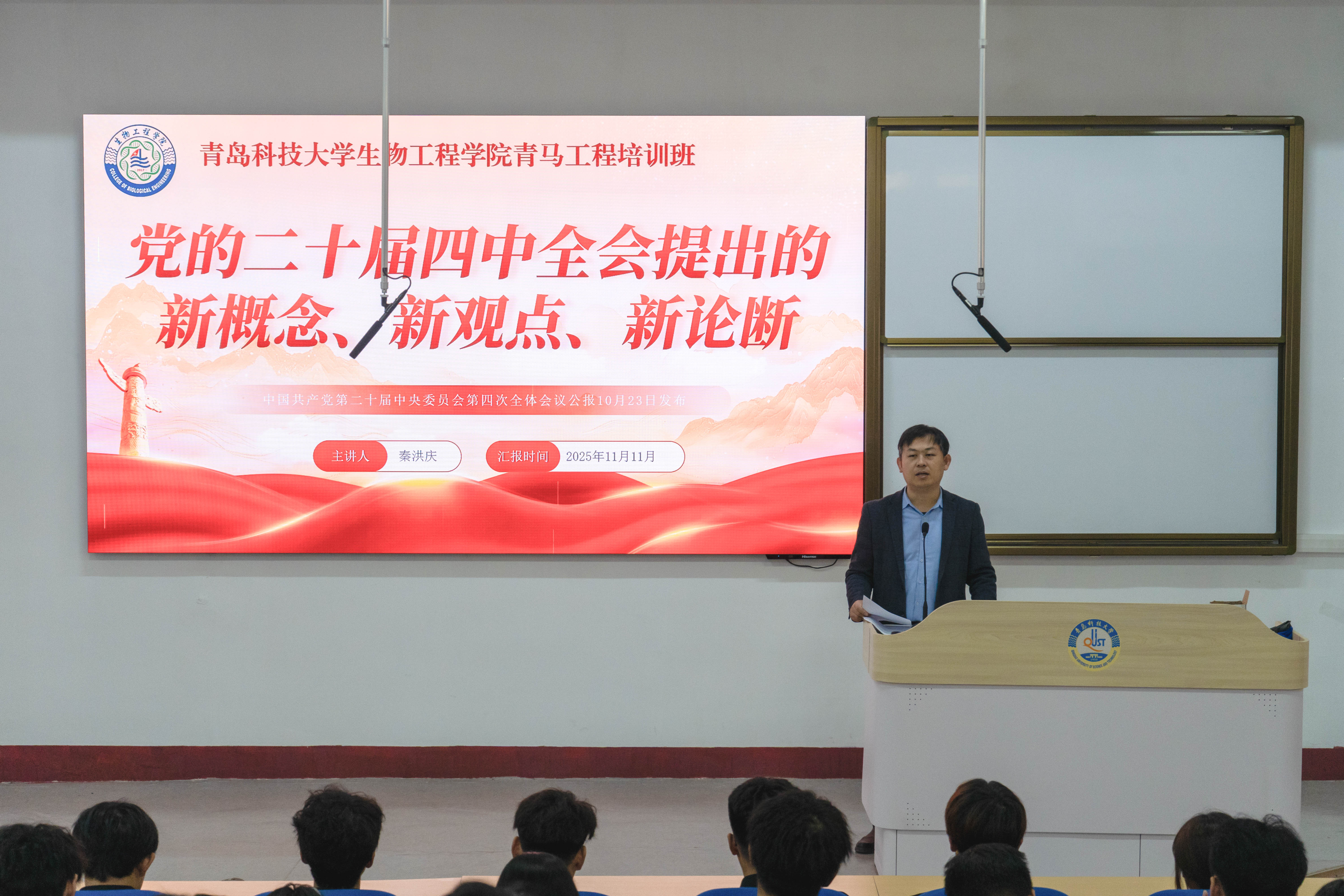 会上,秦洪庆从党的二十届四中全会的重大意义讲起,深入剖析了全会在向第二个百年奋斗目标进军的新征程上的重要地位,强调了全会为“十五五”时期经济社会发展擘画宏伟蓝图、提供根本遵循的重要作用。在培训过程中,他详细解读了“科技更新,产业更实,生活更好,文化更强,能源更绿,国防更安”这六句话所蕴含的全会部署核心要义。他指出,科技更新是引领发展的第一动力,产业更实是经济发展的根基,生活更好是发展的根本目的,文化更强是民族复兴的精神支撑,能源更绿是可持续发展的必由之路,国防更安是发展的根本保障。结合全会提出的一系列新要求,建设现代化产业体系、加快高水平科技自立自强、建设强大国内市场等内容,与同学们进行了深入交流。他强调,作为青马学员,要深刻领会党的二十届四中全会精神,将个人的成长与国家的发展紧密结合起来,在学习和生活中发挥模范带头作用,以实际行动践行“青马”使命,为实现中国式现代化贡献自己的青春力量。