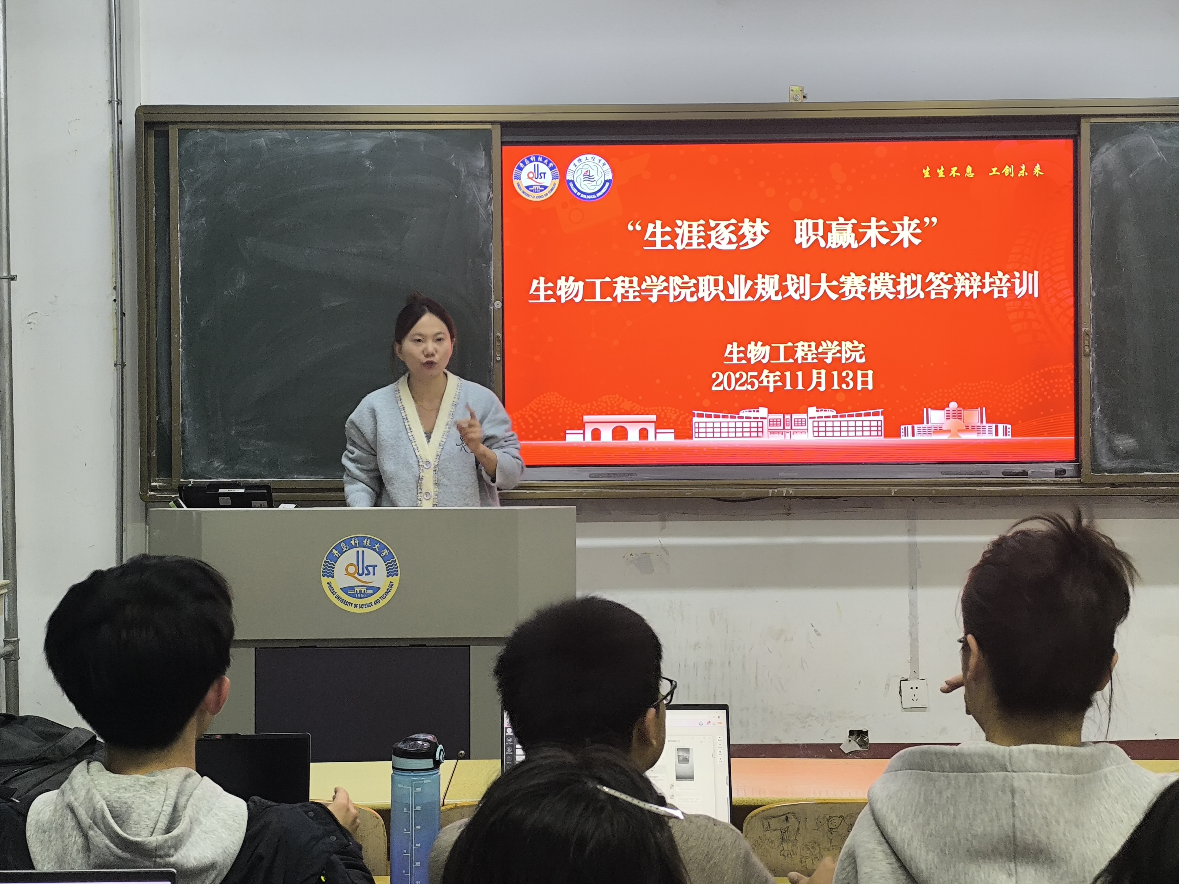 培训会上,郭颖老师从答辩内容构建、PPT展示技巧、现场表达能力及评委提问应答策略等多个核心方面,为同学们进行了系统而深入的讲解与辅导。她结合往年大赛的经典案例和评分标准,精准剖析了答辩环节中的得分要点与常见误区。她强调,一份优秀的职业规划,不仅要“仰望星空”,具备前瞻性和行业高度,更要“脚踏实地”,与个人专业特长和现实发展路径紧密结合。