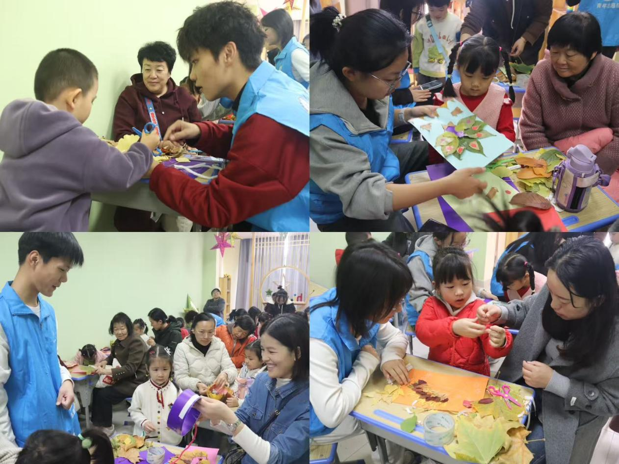活动伊始,小浪花志愿者们率先开展了“关爱儿童成长,守护纯真童心” 心理宣讲。他们结合亲子互动场景,用通俗生动的语言阐释了高质量陪伴对儿童身心健康的重要意义,向在场家庭传递了情感陪伴与心灵呵护的核心理念。宣讲结束后,志愿者引导小朋友们正式开启落叶创作。孩子们迅速投入状态,挑选叶片、构思造型、细致粘贴,动作专注又认真。志愿者们耐心指导裁剪、拼贴技巧,鼓励孩子们大胆发挥想象。指尖翻飞间,普通落叶被赋予新的生命力。活动现场笑声不断,家长们放下忙碌,全身心参与互动,亲子默契在共同创作中悄然升温。作品完成后,孩子们小心翼翼捧着自己的创作,脸上洋溢着满满的成就感,这份快乐与自信,正是对关爱最好的回应。