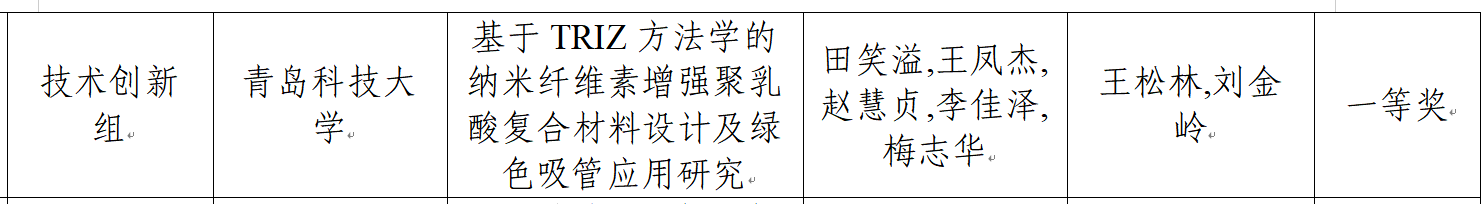 其中,由王松林、刘金岭老师指导的《基于TRIZ方法学的纳米纤维素增强聚乳酸复合材料设计及绿色吸管应用研究》荣获一等奖。