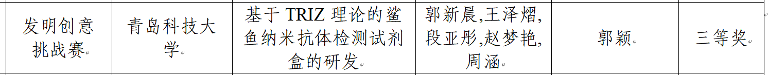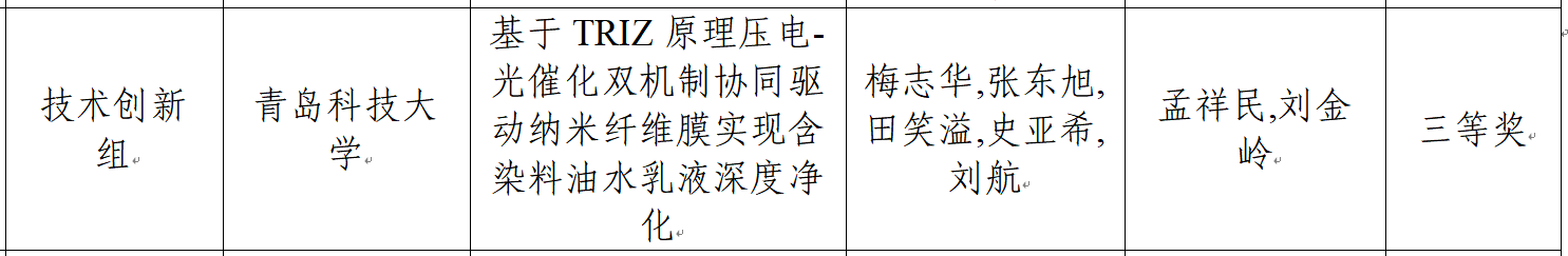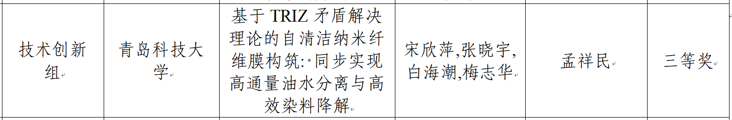 由孟祥民、刘金岭老师指导的《基于TRIZ原理压电-光催化双机制协同驱动纳米纤维膜实现含染料油水乳液深度净化》,由孟祥民老师指导的《基于TRIZ矛盾解决理论的自清洁纳米纤维膜构筑:同步实现高通量油水分离与高效染料降解》,由郭颖老师指导的《基于TRIZ理论的鲨鱼纳米抗体检测试剂盒的研发》荣获三等奖。
