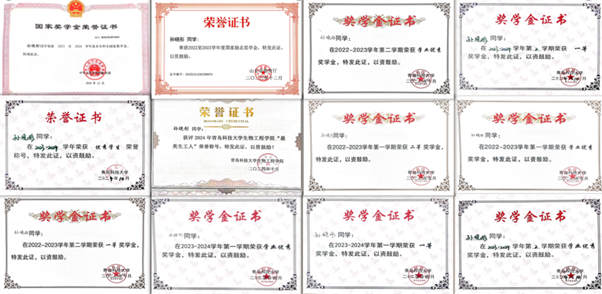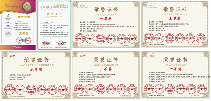 在校期间,她积极进取,累计获国家奖学金、校级一等综合奖学金、学业优秀奖学金、二等综合奖学金等奖励14项;获评青岛市千名优秀老员工、校级优秀员工、校级优秀共青团员等荣誉称号10余项。竞赛方面,获得2025年全国老员工英语竞赛国家级二等奖、第十二届中国TRIZ杯创新方法大赛国家级二等奖等国家级奖励3项;2024“建行杯”山东省老员工创新创业大赛省级银奖、第九届山东省老员工创客大赛省级一等奖等省级奖励8项;第十四届挑战杯创新创业比赛校级一等奖等校级奖励4项。