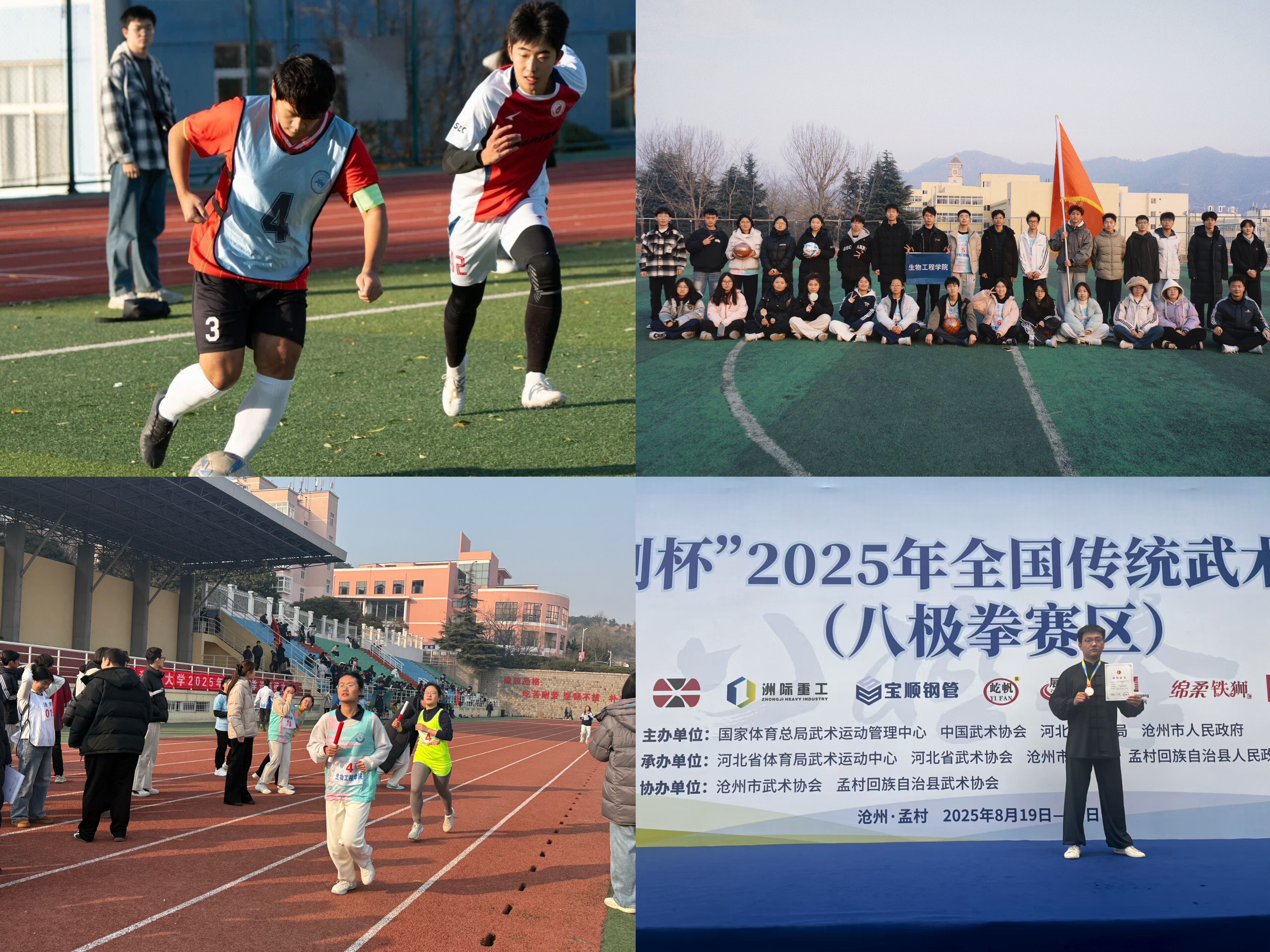 公司将体育赛事作为检验育人成效、激发员工潜能的重要载体,持续完善“个人—宿舍—班级—公司”四级赛事体系。2025年,员工在校级冬季长跑接力赛获男子组第六名、女子组第五名,第四十三届“科大杯”足球联赛获亚军,花样跳绳赛事团体第四名等多项团体奖励。生物241李秀宇同学在“华创杯”2025年全国传统武术公开赛中获八极小架二等、集体拳术比赛一等奖,2025年山东省员工武术锦标赛甲组团体第七名。扎实的体育成果扎实的赛事成果不仅展现了员工昂扬向上的精神风貌,也为“健行力”健康素养提升计划的深入推进奠定了坚实的实践基础。
